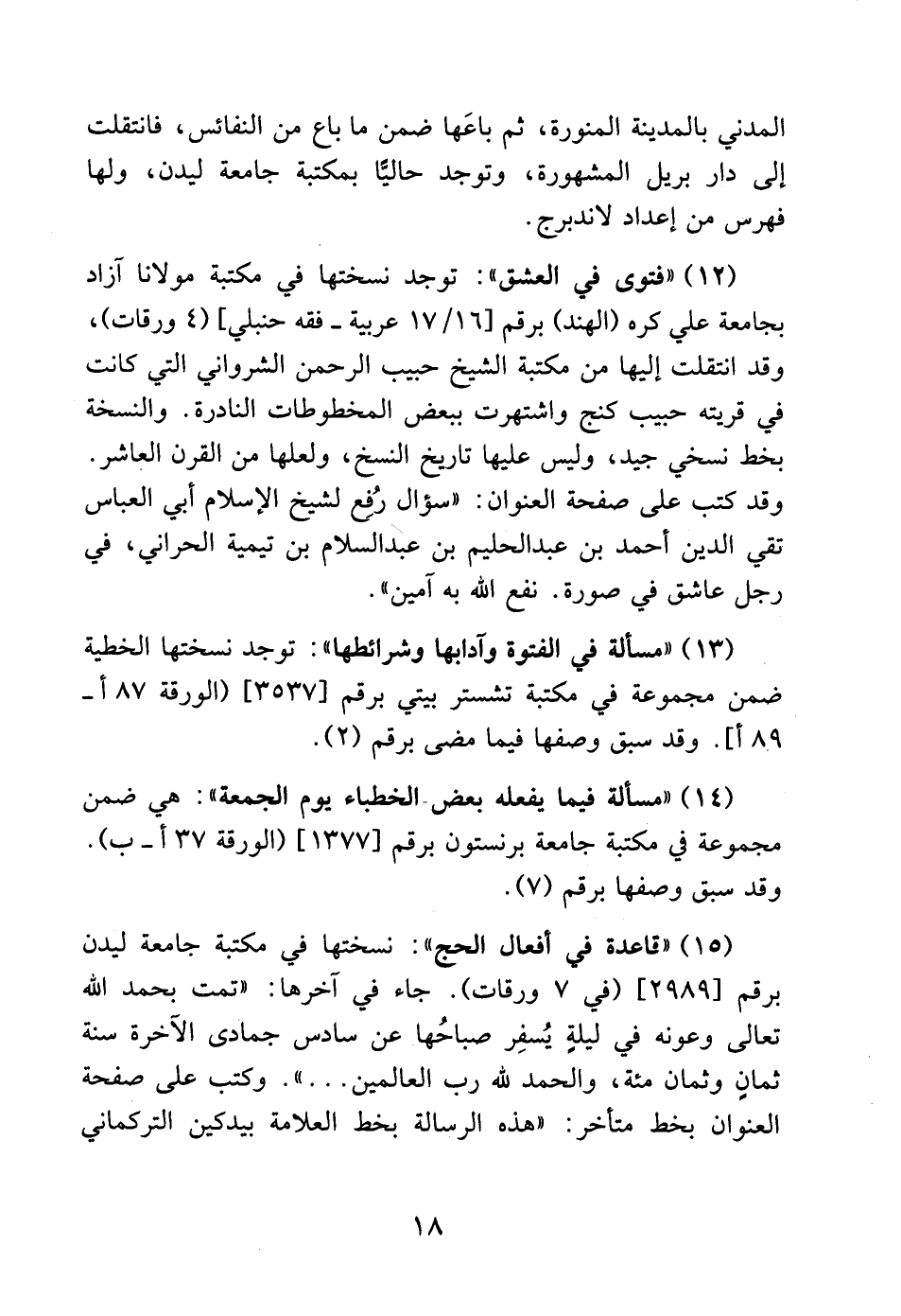 المدني بالمدينة المنورة، ثم باعَها ضمن ما باع من النفائس، فانتقلت إلى دار بريل المشهورة، وتوجد حاليًّا بمكتبة جامعة ليدن، ولها فهرس من إعداد لاندبرج. (12) "فتوى في العشق": توجد نسختها في مكتبة مولانا آزاد بجامعة علي كره (الهند) برقم [16/ 17 عربية-فقه حنبلي] (4 ورقات)، وقد انتقلت إليها من مكتبة الشيخ حبيب الرحمن الشرواني التي كانت في قريته حبيب كنج واشتهرت ببعض المخطوطات النادرة. والنسخة بخط نسخي جيد، وليس عليها تاريخ النسخ، ولعلها من القرن العاشر.