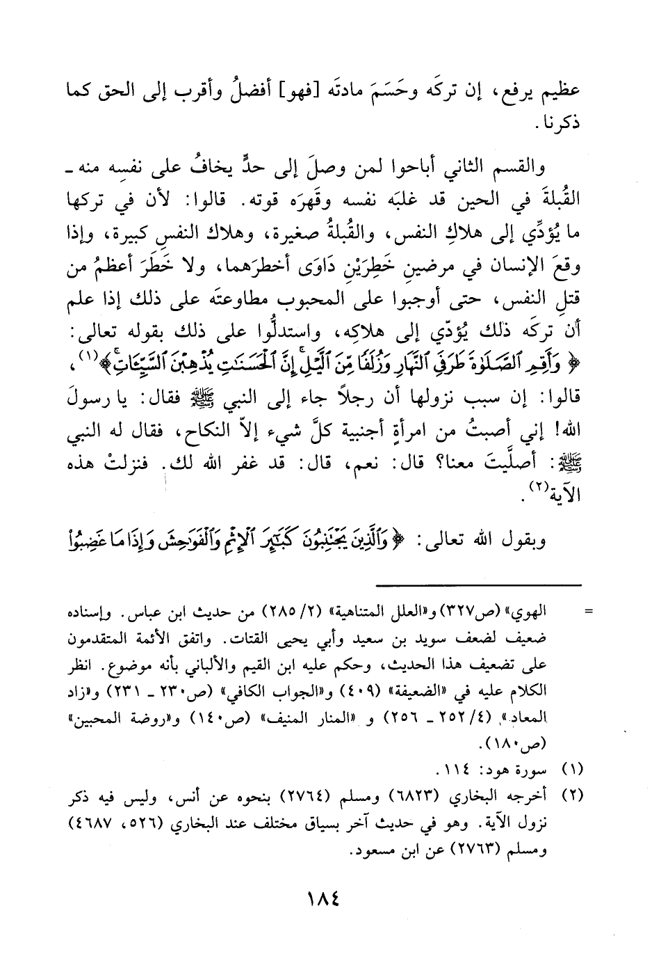 والقسم الثاني أباحوا لمن وصلَ إلى حدٍّ يخافُ على نفسِه منه- القُبلةَ في الحين قد غلبَه نفسه وقَهرَه قوته. قالوا: لأن في تركها ما يُؤدِّي إلى هلاكِ النفس، والقُبلةُ صغيرة، وهلاك النفسِ كبيرة، وإذا وقعَ الإنسان في مرضينِ خَطِرَيْنِ دَاوَى أخطرَهما، ولا خَطَرَ أعظمُ من قتلِ النفس، حتى أوجبوا على المحبوب مطاوعتَه على ذلك إذا علم أن تركَه ذلك يُؤدّي إلى هلاكِه، واستدلُّوا على ذلك بقوله تعالى: (وَأَقِمِ الصَّلاةَ طَرَفَيِ النَّهَارِ وَزُلَفاً مِنَ اللَّيْلِ إِنَّ الْحَسَنَاتِ يُذْهِبْنَ السَّيِّئَاتِ) (1)، قالوا: إن سبب نزولها أن رجلاً جاء إلى النبي - صَلَّى اللَّهُ عَلَيْهِ وَسَلَّمَ - فقال: يا رسولَ الله! إني أصبتُ من امرأة أجنبية كلَّ شيء إلاّ النكاح، فقال له النبي - صَلَّى اللَّهُ عَلَيْهِ وَسَلَّمَ -: أصلَّيتَ معنا؟ قال: نعم، قال: قد غفر الله لك. فنزلتْ هذه الآية (2).