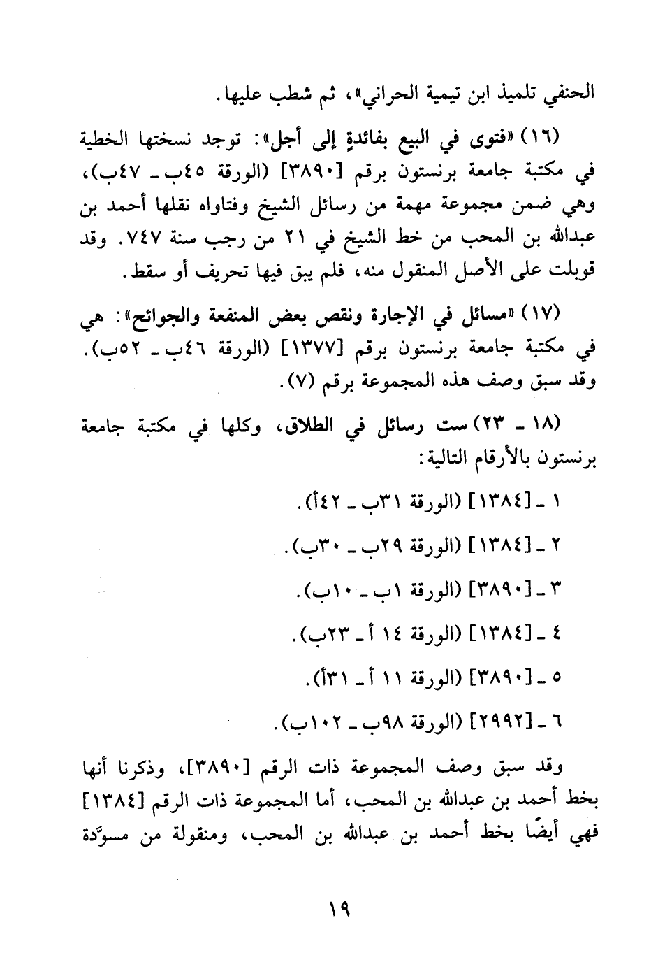 (16) "فتوى في البيع بفائدةِ إلى أجل": توجد نسختها الخطية في مكتبة جامعة برنستون برقم [3890] (الورقة 45 ب-47 ب)، وهي ضمن مجموعة مهمة من رسائل الشيخ وفتاواه نقلها أحمد بن عبد الله بن المحب من خط الشيخ في 21 من رجب سنة 747. وقد قوبلت على الأصل المنقول منه، فلم يبق فيها تحريف أو سقط.