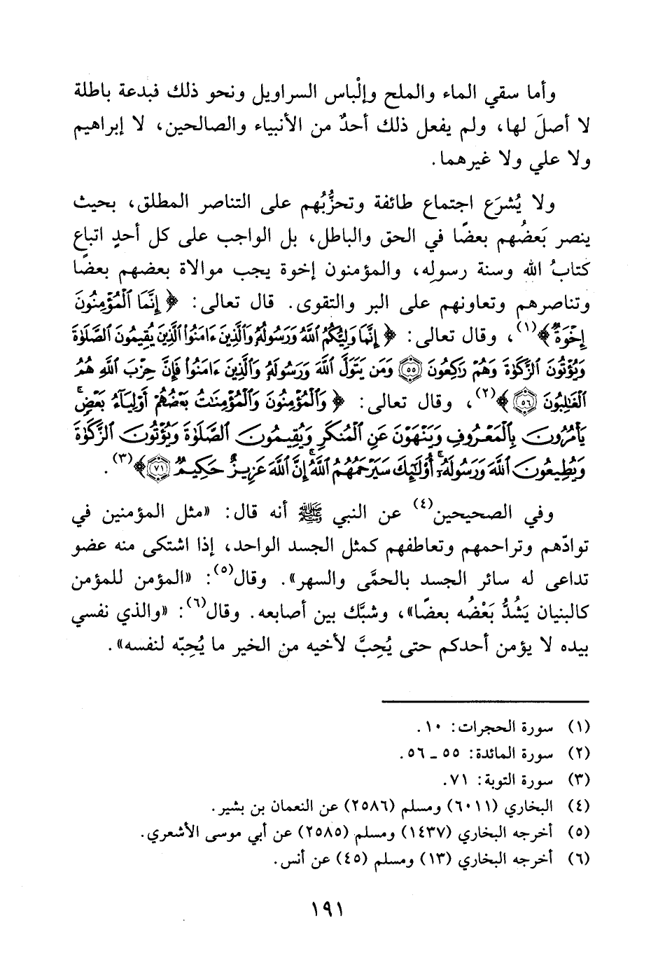 وفي الصحيحين (4) عن النبي - صَلَّى اللَّهُ عَلَيْهِ وَسَلَّمَ - أنه قال: "مثل المؤمنين في توادّهم وتراحمهم وتعاطفهم كمثل الجسد الواحد، إذا اشتكى منه عضو تداعى له سائر الجسد بالحمَّى والسهر". وقال (5): "المؤمن للمؤمن كالبنيان يَشُذُ بَعْضُه بعضا"، وشبك بين أصابعه. وقال (6): "والذي نفسي بيده لا يؤمن أحدكم حتى يُحِب لأخيه من الخير ما يُحِبّه لنفسه".