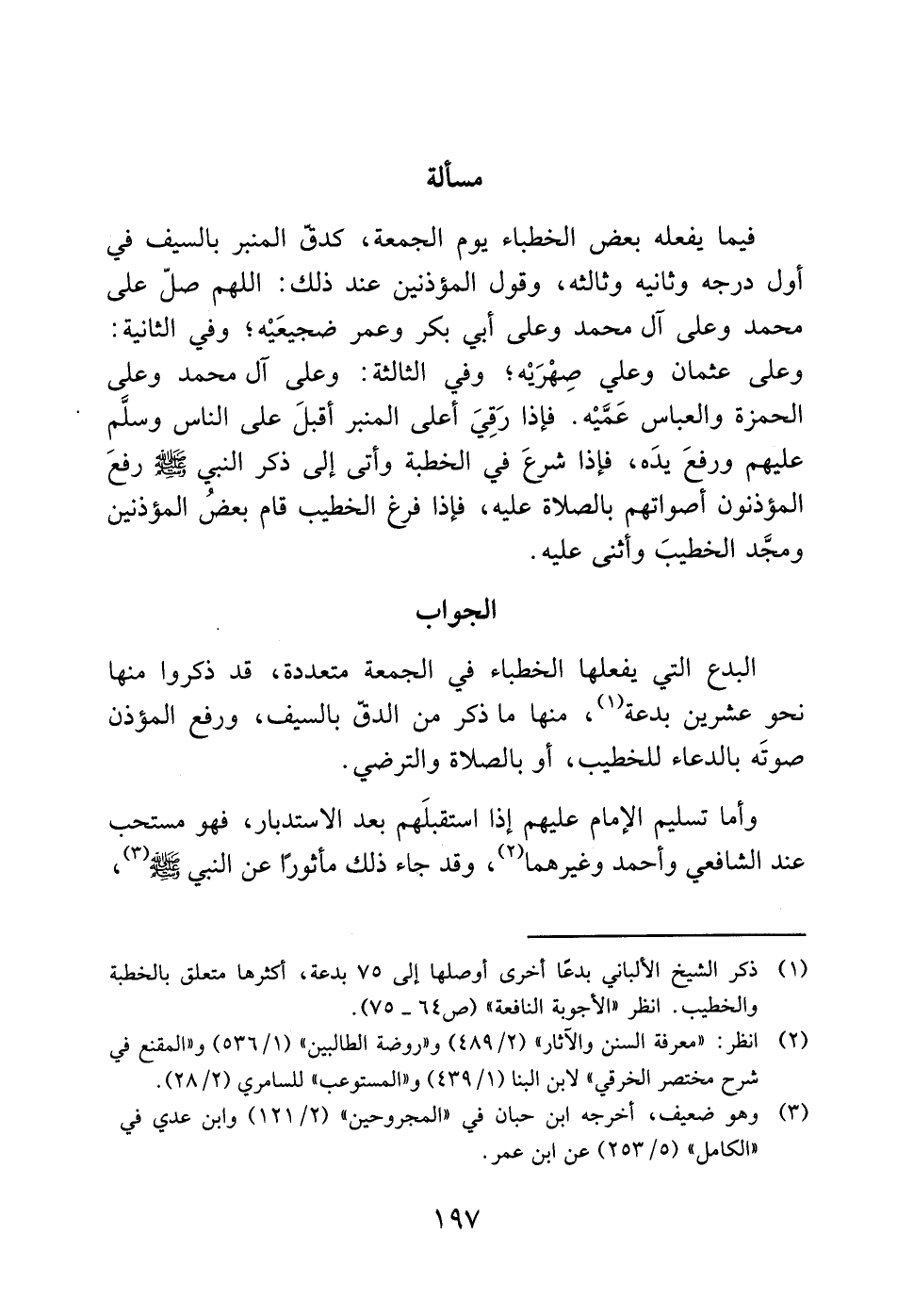 (1) ذكر الشيخ الألباني بدعا أخرى أوصلها إلى 75 بدعة، أكثرها متعلق بالخطبة والخطيب. انظر "الأجوبة النافعة" (ص 64 - 75).