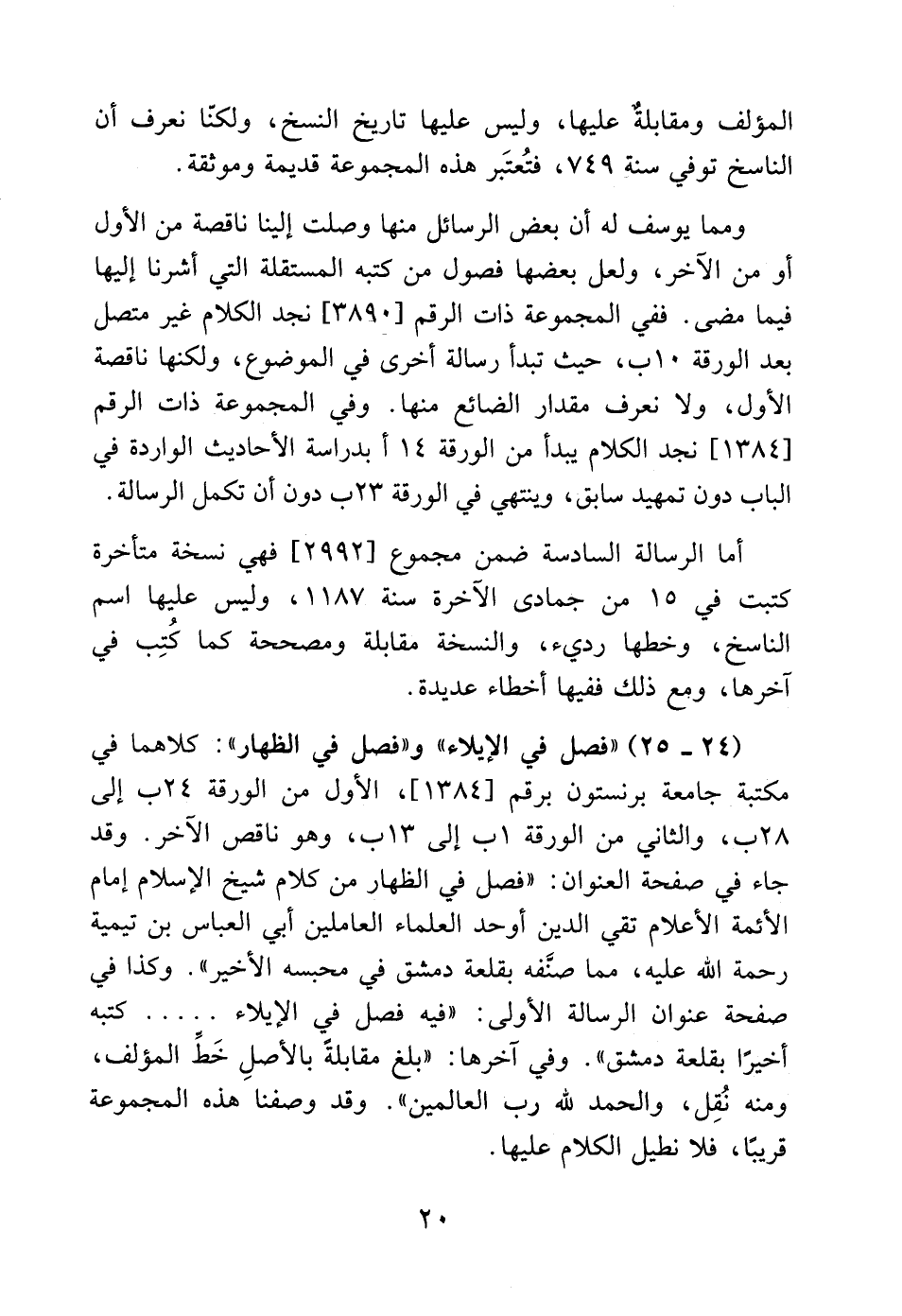 (24 - 25) "فصل في الإيلاء" و"فصل في الظهار": كلاهما في مكتبة جامعة برنستون برقم [1384]، الأول من الورقة 24 ب إلى 28 ب، والثاني من الورقة 1 ب إلى 13 ب، وهو ناقص الآخر. وقد جاء في صفحة العنوان: "فصل في الظهار من كلام شيخ الإسلام إمام الأئمة الأعلام تقي الدين أوحد العلماء العاملين أبي العباس بن تيمية رحمة الله عليه، مما صنفه بقلعة دمشق في محبسه الأخير". وكذا في صفحة عنوان الرسالة الأولى: "فيه فصل في الإيلاء ..... كتبه أخيرًا بقلعة دمشق". وفي آخرها: "بلغ مقابلةً بالأصلِ خَطِّ المؤلف، ومنه نُقِل، والحمد لله رب العالمين". وقد وصفنا هذه المجموعة قريبًا، فلا نطيل الكلام عليها.