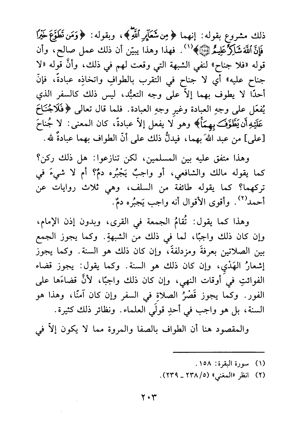 ذلك مشروع بقوله: إنهما (مِنْ شَعَائِرِ اللَّهِ)، وبقوله: (وَمَنْ تَطَوَّعَ خَيْراً فَإِنَّ اللَّهَ شَاكِرٌ عَلِيمٌ (158)) (1). فهذا وهذا يبيّن أن ذلك عمل صالح، وأن قوله "فلا جناح" لنفي الشبهة التي وقعت لهم في ذلك، وأنَ قوله "لا جناح عليه" أي لا جناح في التقرب بالطوافِ واتخاذِه عبادةً، فإنّ أحدًا لا يطوف بهما إلاّ على وجه التعبُّد، ليس ذلك كالسفر الذي يُفعَل على وجهِ العبادة وغيرِ وجهِ العبادة. فلما قال تعالى (فَلا جُنَاحَ عَلَيْهِ أَنْ يَطَّوَّفَ بِهِمَا) وهو لا يفعل إلاّ عبادةً، كان المعنى: لا جُناحَ [على] من عبد الله بهما، فيدلُّ ذلك على أنّ الطواف بهما عبادةٌ لله.