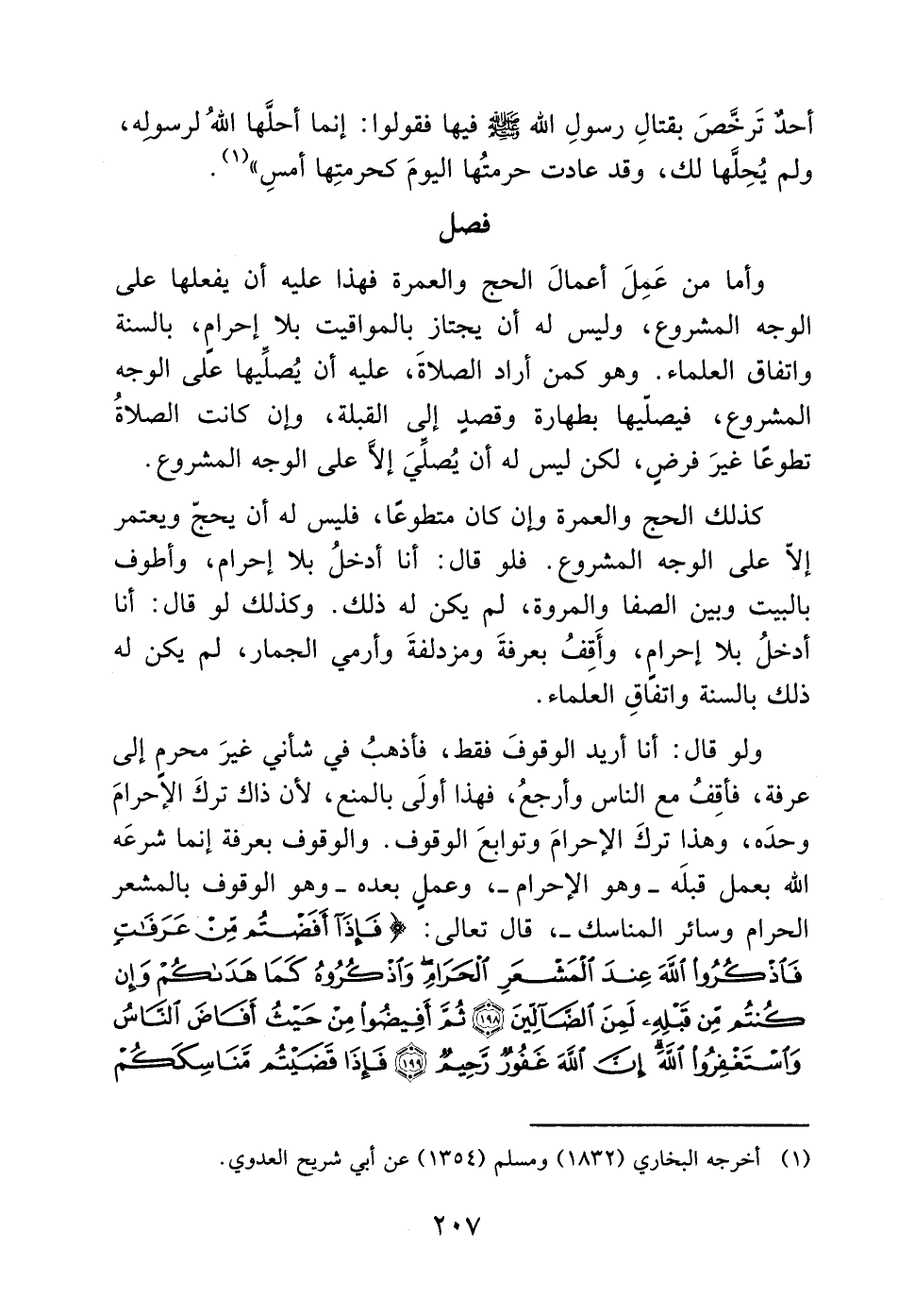 كذلك الحج والعمرة وإن كان متطوعًا، فليس له أن يحجّ ويعتمر إلاّ على الوجه المشروع. فلو قال: أنا أدخلُ بلا إحرام، وأطوف بالبيت وبين الصفا والمروة، لم يكن له ذلك. وكذلك لو قال: أنا أدخلُ بلا إحرامٍ، وأَقِفُ بعرفةَ ومزدلفةَ وأرمي الجمار، لم يكن له ذلك بالسنة واتفاقِ العلماء.