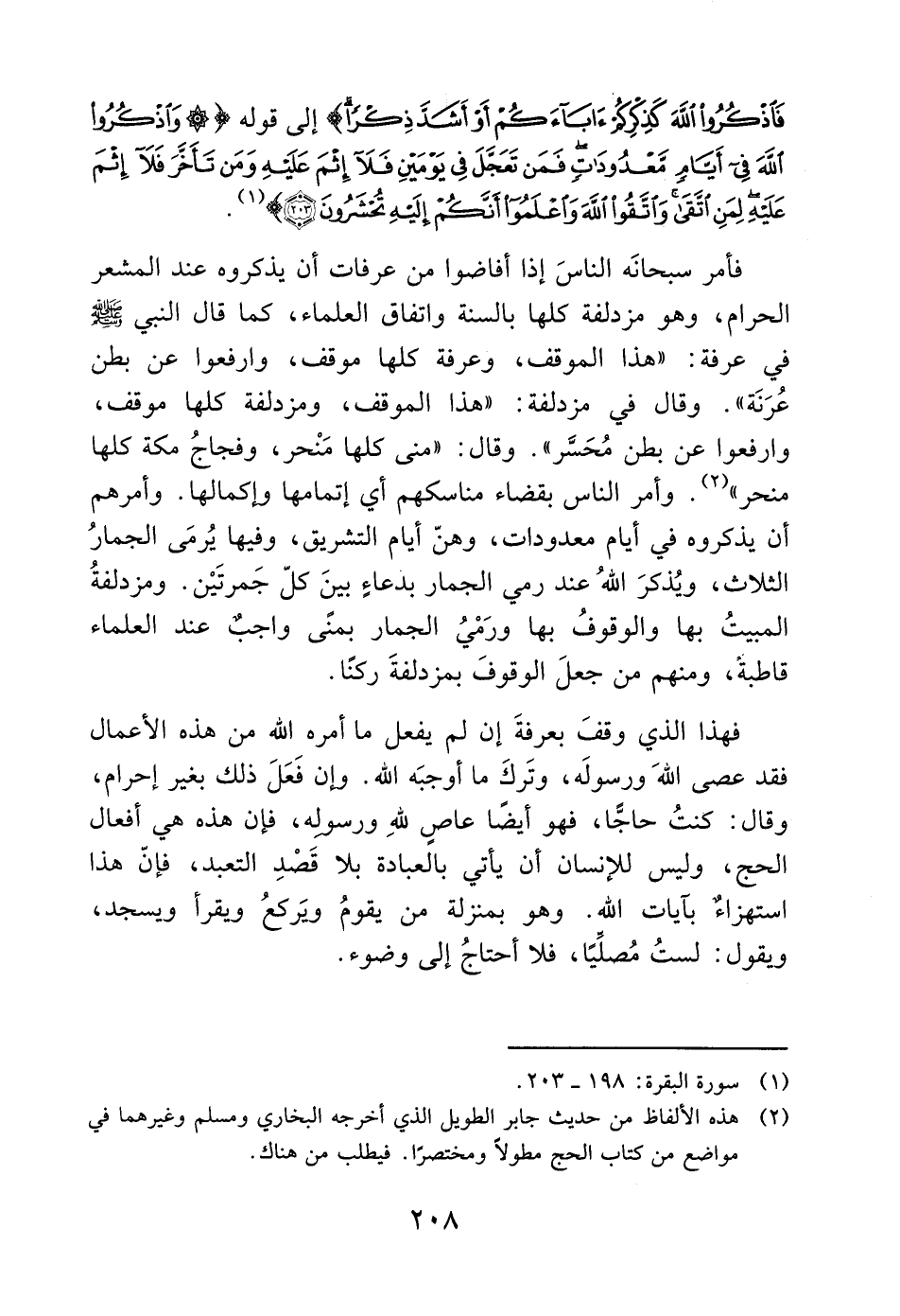 فأمر سبحانَه الناسَ إذا أفاضوا من عرفات أن يذكروه عند المشعر الحرام، وهو مزدلفة كلها بالسنة واتفاق العلماء، كما قال النبي - صَلَّى اللَّهُ عَلَيْهِ وَسَلَّمَ - في عرفة: "هذا الموقف، وعرفة كلها موقف، وارفعوا عن بطن عُرَنَة". وقال في مزدلفة: "هذا الموقف، ومزدلفة كلها موقف، وارفعوا عن بطن مُحَسَّر". وقال: "منى كلها مَنْحر، وفجاجُ مكة كلها منحر" (2). وأمر الناس بقضاء مناسكهم أي إتمامها وإكمالها. وأمرهم أن يذكروه في أيام معدودات، وهنّ أيام التشريق، وفيها يُرمَى الجمارُ الثلاث، ويُذكرَ اللهُ عند رمي الجمار بدعاءٍ بينَ كلّ جَمرتَيْن. ومزدلفةُ المبيتُ بها والوقوفُ بها ورَمْيُ الجمار بمنًى واجب عند العلماء قاطبة، ومنهم من جعلَ الوقوفَ بمزدلفةَ ركنًا.