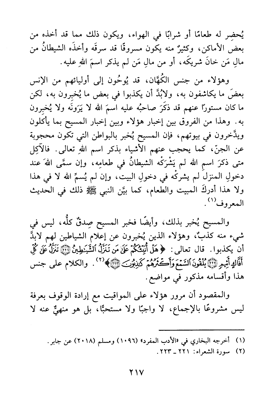 وهؤلاء من جنس الكُهَّان، قد يُوحُون إلى أوليائهم من الإنس بعضَ ما يكاشفون به، ولابُدَّ أن يكذبوا في بعض ما يُخبِرون به، لكن ما كان مستورًا عنهم قد ذكَرَ صاحبُه عليه اسمَ الله لا يَرَونَه ولا يُخبِرون به. وهذا من الفروق بين إخبار هؤلاء وبين إخبار المسيح بما يأكلون ويدَّخرون في بيوتهم، فإن المسيح يُخبر بالبواطن التي تكون محجوبة عن الجنّ، كما يحجب عنهم الأشياء بذكر اسم الله تعالى. فالآكِل متى ذكرَ اسمِ الله لم يَشْرَكْه الشيطانُ في طعامِه، وإن سمَّى الله عند دخولِ المنزل لم يشركْه في دخولِ البيت، وإن لم يُسمِّ الله لا في هذا ولا هذا أدركَ المبيت والطعام، كما بيَّن النبي - صَلَّى اللَّهُ عَلَيْهِ وَسَلَّمَ - ذلك في الحديث المعروف (1).
