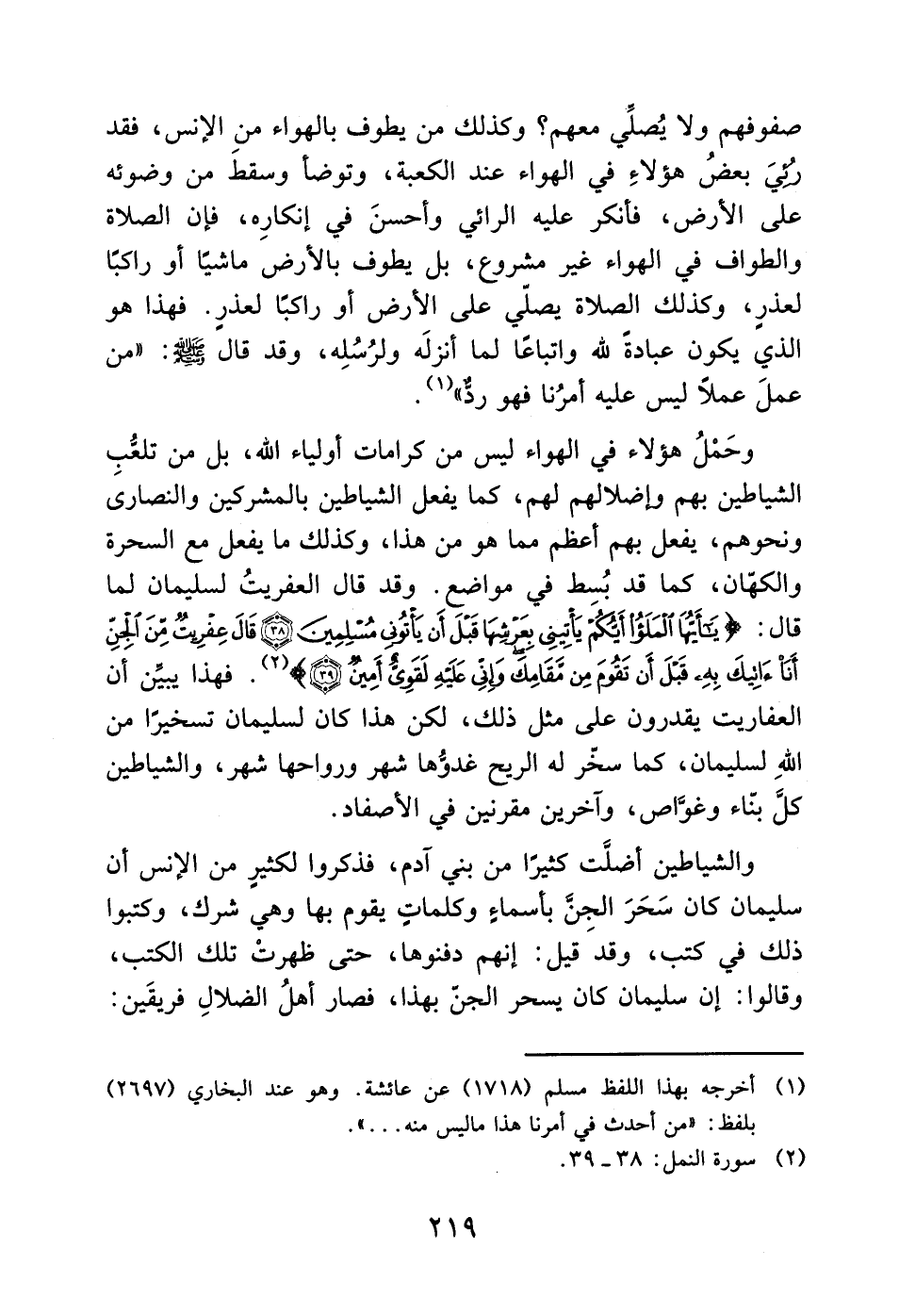 وحَمْلُ هؤلاء في الهواء ليس من كرامات أولياء الله، بل من تلعُّبِ الشياطين بهم وإضلالهم لهم، كما يفعل الشياطين بالمشركين والنصارى ونحوهم، يفعل بهم أعظم مما هو من هذا، وكذلك ما يفعل مع السحرة والكفان، كما قد بُسط في مواضع. وقد قال العفريتُ لسليمان لما قال: (يَا أَيُّهَا الْمَلَأُ أَيُّكُمْ يَأْتِينِي بِعَرْشِهَا قَبْلَ أَنْ يَأْتُونِي مُسْلِمِينَ (38) قَالَ عِفْرِيتٌ مِنَ الْجِنِّ أَنَا آتِيكَ بِهِ قَبْلَ أَنْ تَقُومَ مِنْ مَقَامِكَ وَإِنِّي عَلَيْهِ لَقَوِيٌّ أَمِينٌ (39)) (2). فهذا يبين أن العفاريت يقدرون على مثل ذلك، لكن هذا كان لسليمان تسخيرًا من الله لسليمان، كما سخر له الريح غدوُّها شهر ورواحها شهر، والشياطين كل بناء وغوَّاص، وآخرين مقرنين في الأصفاد.