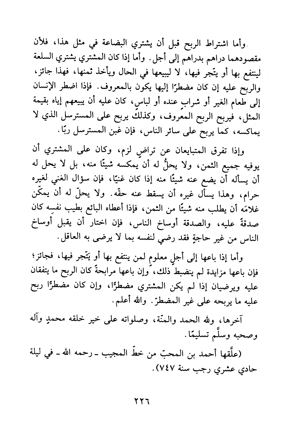 وأما اشتراط الربح قبل أن يشتري البضاعة في مثل هذا، فلأن مقصودهما دراهم بدراهم إلى أجل. وأما إذا كان المشتري يشتري السلعة لينتفع بها أو يتّجر فيها، لا ليبيعها في الحال ويأخذ ثمنها، فهذا جائز، والربح عليه إن كان مضطرًا إليها يكون بالمعروف. فإذا اضطر الإنسان إلى طعام الغير أو شرابٍ عنده أو لباسٍ، كان عليه أن يبيعهم إياه بقيمة المثل، فيربح الربح المعروف، وكذلك يربح على المسترسل الذي لا يماكسه، كما يربح على سائر الناس، فإن غبن المسترسل ربًا.