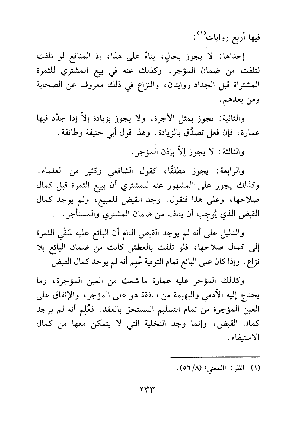 إحداها: لا يجوز بحالٍ، بناءً على هذا، إذ المنافع لو تلفت لتلفت من ضمان المؤجر. وكذلك عنه في بيع المشتري للثمرة المشتراة قبل الجداد روايتان، والنزاع في ذلك معروف عن الصحابة ومن بعدهم.