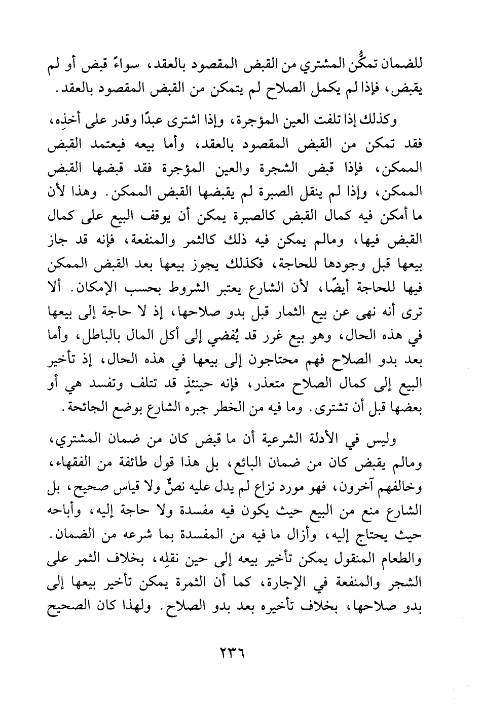 وليس في الأدلة الشرعية أن ما قبض كان من ضمان المشتري، ومالم يقبض كان من ضمان البائع، بل هذا قول طائفة من الفقهاء، وخالفهم آخرون، فهو مورد نزاع لم يدل عليه نصٌّ ولا قياس صحيح، بل الشارع منع من البيع حيث يكون فيه مفسدة ولا حاجة إليه، وأباحه حيث يحتاج إليه، وأزال ما فيه من المفسدة بما شرعه من الضمان.