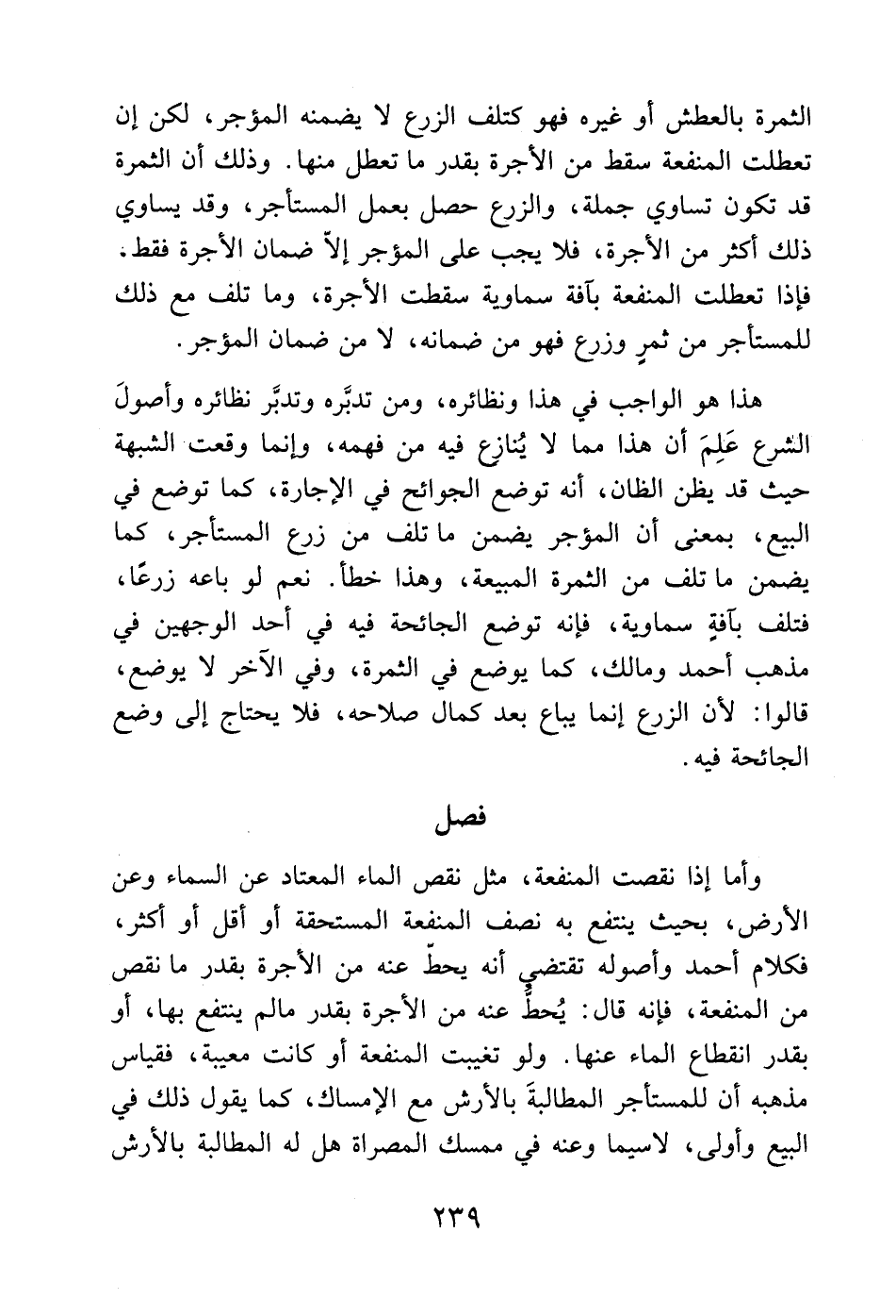 هذا هو الواجب في هذا ونظائره، ومن تدبَّره وتدبَّر نظائره وأصولَ الشرع عَلِمَ أن هذا مما لا يُنازع فيه من فهمه، وإنما وقعت الشبهة حيث قد يظن الظان، أنه توضع الجوائح في الإجارة، كما توضع في البيع، بمعنى أن المؤجر يضمن ما تلف من زرع المستأجر، كما يضمن ما تلف من الثمرة المبيعة، وهذا خطأ. نعم لو باعه زرعًا، فتلف بآفةٍ سماوية، فإنه توضع الجائحة فيه في أحد الوجهين في مذهب أحمد ومالك، كما يوضع في الثمرة، وفي الآخر لا يوضع، قالوا: لأن الزرع إنما يباع بعد كمال صلاحه، فلا يحتاج إلى وضع الجائحة فيه.