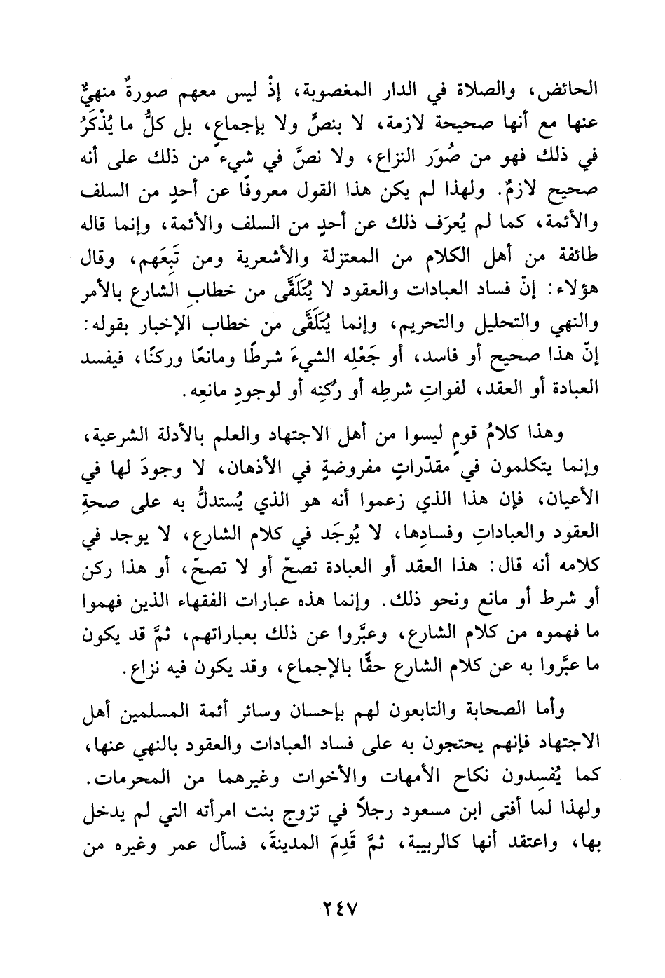 وهذا كلامُ قومٍ ليسوا من أهل الاجتهاد والعلم بالأدلة الشرعية، وإنما يتكلمون في مقدّراتٍ مفروضةٍ في الأذهان، لا وجودَ لها في الأعيان، فإن هذا الذي زعموا أنه هو الذي يُستدلُّ به على صحةِ العقود والعباداتِ وفسادِها، لا يُوجَد في كلام الشارع، لا يوجد في كلامه أنه قال: هذا العقد أو العبادة تصحّ أو لا تصحّ، أو هذا ركن أو شرط أو مانع ونحو ذلك. وإنما هذه عبارات الفقهاء الذين فهموا ما فهموه من كلام الشارع، وعبَّروا عن ذلك بعباراتهم، ثمَّ قد يكون ما عبَّروا به عن كلام الشارع حقًّا بالإجماع، وقد يكون فيه نزاع.