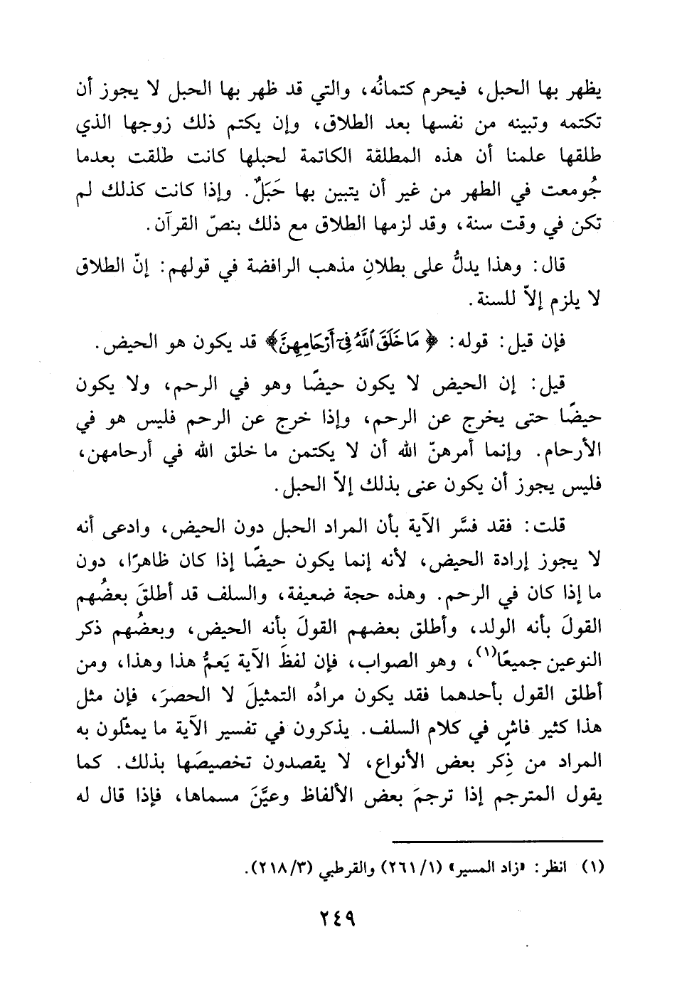 قلت: فقد فسَّر الآية بأن المراد الحبل دون الحيض، وادعى أنه لا يجوز إرادة الحيض، لأنه إنما يكون حيضًا إذا كان ظاهرًا، دون ما إذا كان في الرحم. وهذه حجة ضعيفة، والسلف قد أطلقَ بعضُهم القولَ بأنه الولد، وأطلق بعضهم القولَ بأنه الحيض، وبعضُهم ذكر النوعين جميعًا (1)، وهو الصواب، فإن لفظَ الآية يَعمُّ هذا وهذا، ومن أطلق القول بأحدهما فقد يكون مرادُه التمثيلَ لا الحصرَ، فإن مثل هذا كثير فاشٍ في كلام السلف. يذكرون في تفسير الآية ما يمثلون به المراد من ذِكر بعض الأنواع، لا يقصدون تخصيصَها بذلك. كما يقول المترجم إذا ترجمَ بعض الألفاظ وعينَ مسماها، فإذا قال له