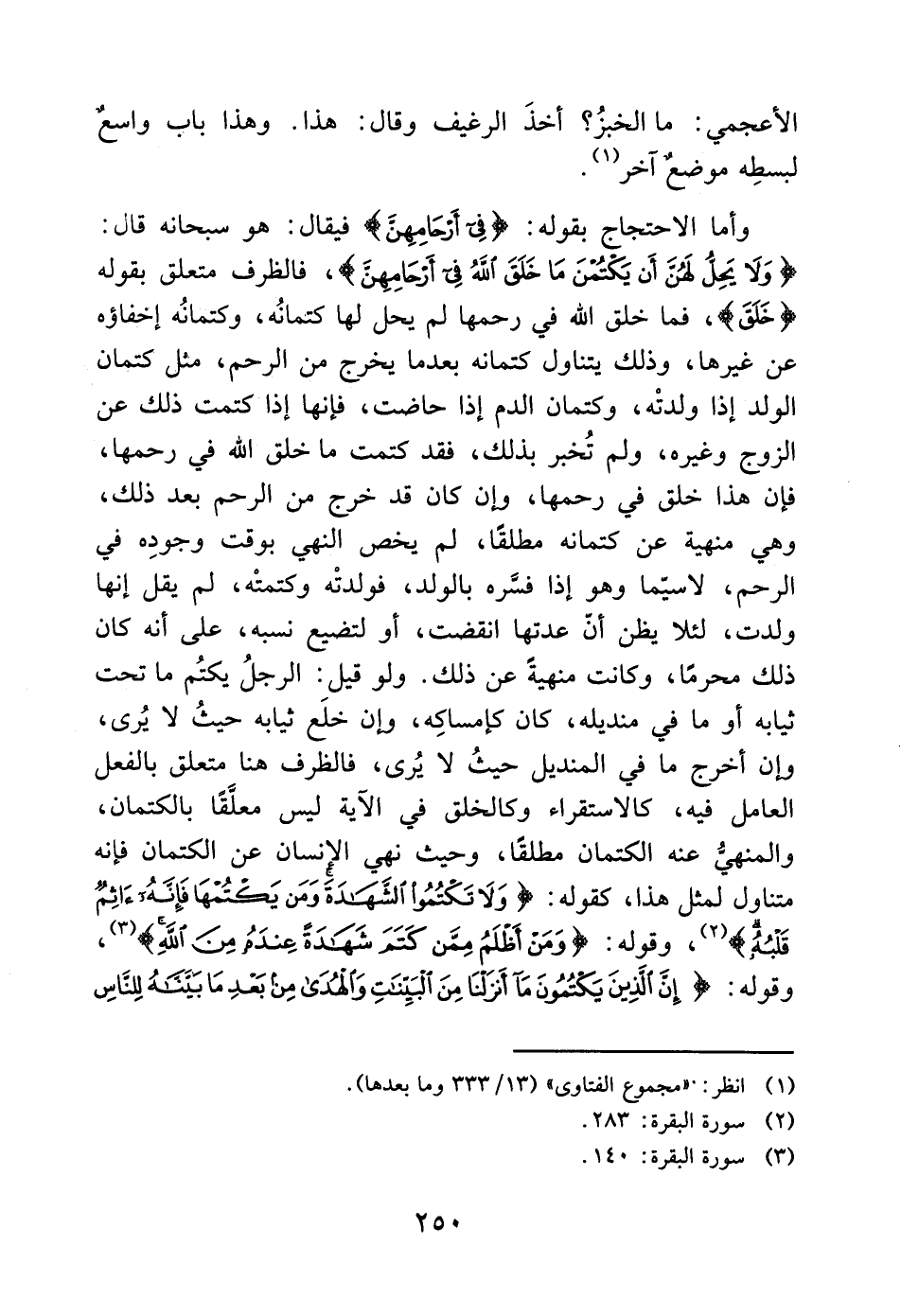 (وَلا يَحِلُّ لَهُنَّ أَنْ يَكْتُمْنَ مَا خَلَقَ اللَّهُ فِي أَرْحَامِهِنَّ)، فالظرف متعلق بقوله (خَلَقَ)، فما خلق الله في رحمها لم يحل لها كتمانُه، وكتمانُه إخفاؤه عن غيرها، وذلك يتناول كتمانه بعدما يخرج من الرحم، مثل كتمان الولد إذا ولدتْه، وكتمان الدم إذا حاضت، فإنها إذا كتمت ذلك عن الزوج وغيره، ولم تُخبر بذلك، فقد كتمت ما خلق الله في رحمها، فإن هذا خلق في رحمها، وإن كان قد خرج من الرحم بعد ذلك، وهي منهية عن كتمانه مطلقًا، لم يخص النهي بوقت وجودِه في الرحم، لاسيّما وهو إذا فسَّره بالولد، فولدتْه وكتمتْه، لم يقل إنها ولدت، لئلا يظن أنّ عدتها انقضت، أو لتضيع نسبه، على أنه كان ذلك محرمًا، وكانت منهيةً عن ذلك. ولو قيل: الرجلُ يكتُم ما تحت ثيابه أو ما في منديله، كان كإمساكِه، وإن خلَع ثيابه حيثُ لا يُرى، وإن أخرج ما في المنديل حيثُ لا يُرى، فالظرف هنا متعلق بالفعل العامل فيه، كالاستقراء وكالخلق في الآية ليس معلَّقا بالكتمان، والمنهيُّ عنه الكتمان مطلقًا، وحيث نهي الإنسان عن الكتمان فإنه متناول لمثل هذا، كقوله: (وَلا تَكْتُمُوا الشَّهَادَةَ وَمَنْ يَكْتُمْهَا فَإِنَّهُ آثِمٌ قَلْبُهُ) (2)، وقوله: (وَمَنْ أَظْلَمُ مِمَّنْ كَتَمَ شَهَادَةً عِنْدَهُ مِنَ اللَّهِ) (3)، وقوله: (إِنَّ الَّذِينَ يَكْتُمُونَ مَا أَنْزَلْنَا مِنَ الْبَيِّنَاتِ وَالْهُدَى مِنْ بَعْدِ مَا بَيَّنَّاهُ لِلنَّاسِ