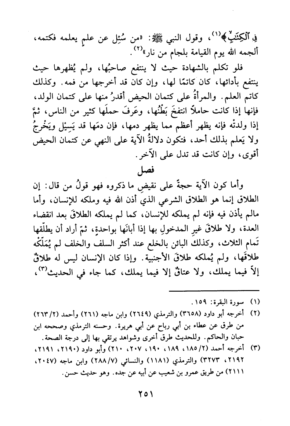 فِي الْكِتَابِ) (1)، وقول النبي - صَلَّى اللَّهُ عَلَيْهِ وَسَلَّمَ -: "من سُئِل عن علمٍ يعلمه فكتمه، ألجمه الله يوم القيامة بلجام من نار" (2).