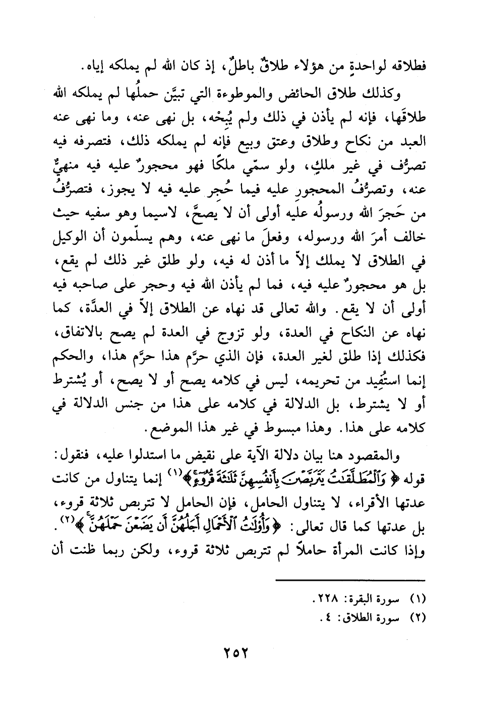 وكذلك طلاق الحائض والموطوءة التي تبيَّن حملُها لم يملكه الله طلاقَها، فإنه لم يأذن في ذلك ولم يُبحْه، بل نهى عنه، وما نهى عنه العبد من نكاح وطلاق وعتق وبيع فَإنه لم يملكه ذلك، فتصرفه فيه تصرُّف في غير ملكٍ، ولو سمّي ملكًا فهو محجور عليه فيه منهي عنه، وتصرُّفُ المحجورِ عليه فيما حُجِر عليه فيه لا يجوز، فتصرُّفُ من حَجرَ الله ورسولُه عليه أولى أن لا يصحَّ، لاسيما وهو سفيه حيث خالف أمرَ الله ورسوله، وفعلَ ما نهى عنه، وهم يسلمون أن الوكيل في الطلاق لا يملك إلاّ ما أذن له فيه، ولو طلق غير ذلك لم يقع، بل هو محجور عليه فيه، فما لم يأذن الله فيه وحجر على صاحبه فيه أولى أن لا يقع. والله تعالى قد نهاه عن الطلاق إلاّ في العدَّة، كما نهاه عن النكاح في العدة، ولو تزوج في العدة لم يصح بالاتفاق، فكذلك إذا طلق لغير العدة، فإن الذي حرَّم هذا حرَّم هذا، والحكم إنما استفيد من تحريمه، ليس في كلامه يصح أو لا يصح، أو يُشترط أو لا يشترط، بل الدلالة في كلامه على هذا من جنس الدلالة في كلامه على هذا. وهذا مبسوط في غير هذا الموضع.