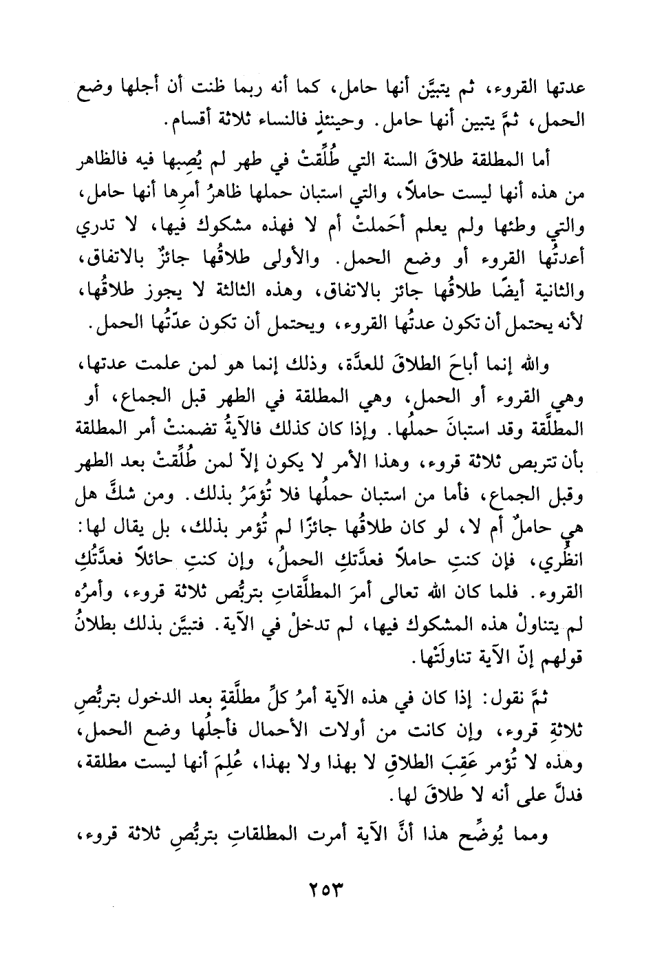 أما المطلقة طلاقَ السنة التي طُلِّقتْ في طهر لم يُصِبها فيه فالظاهر من هذه أنها ليست حاملاً، والتي استبان حملها ظاهرُ أمرِها أنها حامل، والتي وطئها ولم يعلم أحَملتْ أم لا فهذه مشكوك فيها، لا تدري أعدتُها القروء أو وضع الحمل. والأولى طلاقُها جائز بالاتفاق، والثانية أيضًا طلاقُها جائز بالاتفاق، وهذه الثالثة لا يجوز طلاقُها، لأنه يحتمل أن تكون عدتُها القروء، ويحتمل أن تكون عدّتُها الحمل.
