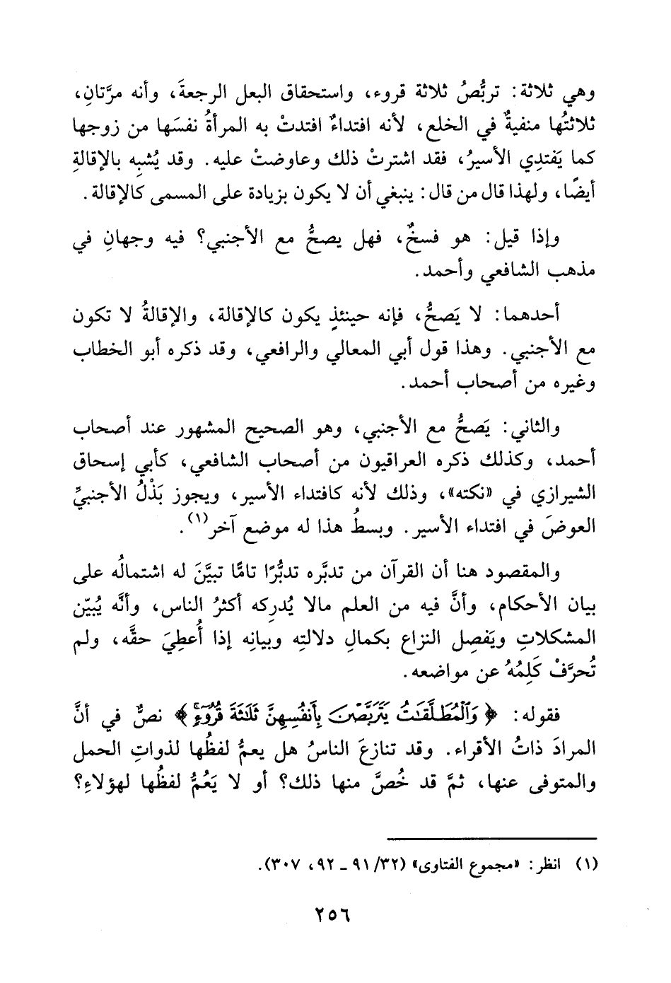 فقوله: (وَالْمُطَلَّقَاتُ يَتَرَبَّصْنَ بِأَنْفُسِهِنَّ ثَلاثَةَ قُرُوءٍ) نصٌّ في أنَّ المرادَ ذاتُ الأقراء. وقد تنازعَ الناسُ هل يعمُّ لفظُها لذواتِ الحمل والمتوفى عنها، ثمَّ قد خُصَّ منها ذلك؟ أو لا يَعُمُّ لفظُها لهؤلاءِ؟