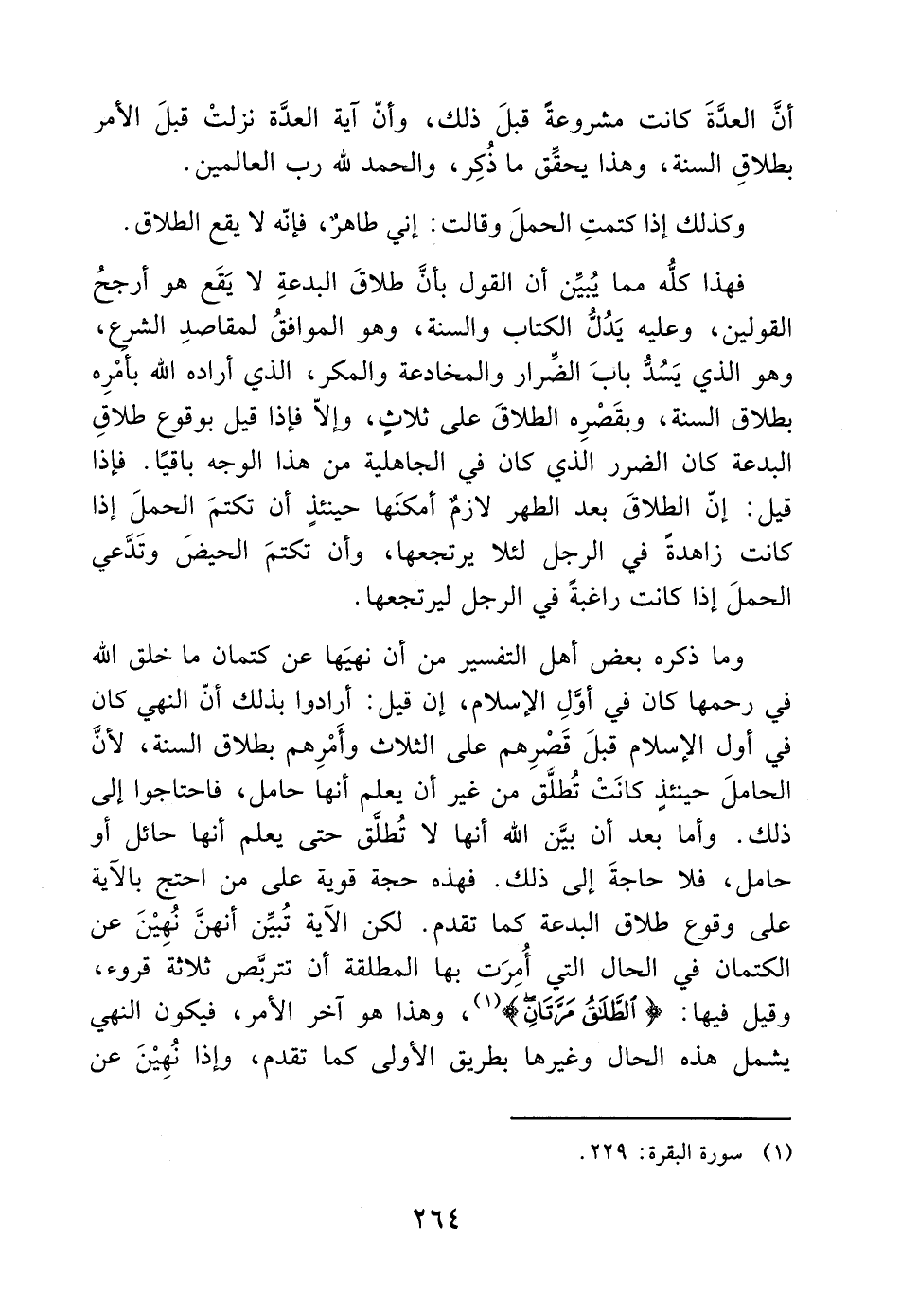 فهذا كلُّه ما يُبيِّن أن القول بأنَّ طلاقَ البدعةِ لا يَقَع هو أرجحُ القولين، وعليه يَدُلُّ الكتاب والسنة، وهو الموافقُ لمقاصدِ الشرع، وهو الذي يَسُدُّ بابَ الضِّرار والمخادعة والمكر، الذي أراده الله بأمْرِه بطلاق السنة، وبقَصرِه الطلاقَ على ثلاثٍ، وإلاّ فإذا قيل بوقوع طلاقِ البدعة كان الضرر الذي كان في الجاهلية من هذا الوجه باقيًا. فإذا قيل: إنّ الطلاقَ بعد الطهر لازمٌ أمكنَها حينئذٍ أن تكتمَ الحملَ إذا كانت زاهدةً في الرجل لئلا يرتجعها، وأن تكتمَ الحيضَ وتَدَّعي الحملَ إذا كانت راغبةً في الرجل ليرتجعها.