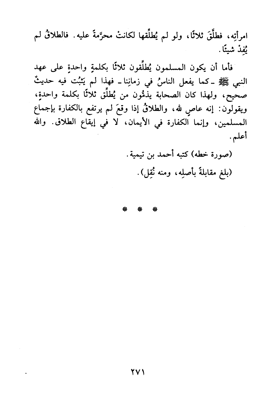 فأما أن يكون المسلمون يُطلِّقون ثلاثًا بكلمةٍ واحدةٍ على عهد النبي - صَلَّى اللَّهُ عَلَيْهِ وَسَلَّمَ - - كما يفعل الناسُ في زمانِنا - فهذا لم يَثبُت فيه حديثٌ صحيح، ولهذا كان الصحابة يذمُون من يُطلِّق ثلاثًا بكلمة واحدةِ، ويقولون: إنه عاصِ لله، والطلاقُ إذا وقعَ لم يرتفع بالكفارة بإجماع المسلمين، وإنما الكفارة في الأيمان، لا في إيقاع الطلاق. والله