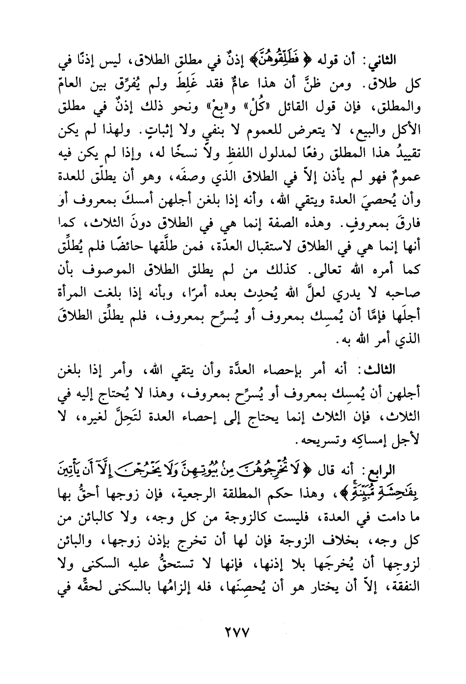 الرابع: أنه قال (لَا تُخْرِجُوهُنَّ مِنْ بُيُوتِهِنَّ وَلَا يَخْرُجْنَ إِلَّا أَنْ يَأْتِينَ بِفَاحِشَةٍ مُبَيِّنَةٍ)، وهذا حكم المطلقة الرجعية، فإن زوجها أحق بها ما دامت في العدة، فليست كالزوجة من كل وجه، ولا كالبائن من كل وجه، بخلاف الزوجة فإن لها أن تخرج بإذن زوجها، والبائن لزوجها أن يُخرجَها بلا إذنها، فإنها لا تستحق عليه السكنى ولا النفقَة، إلاّ أن يختار هو أن يُحصِنَها، فله إلزامُها بالسكنى لحقه في