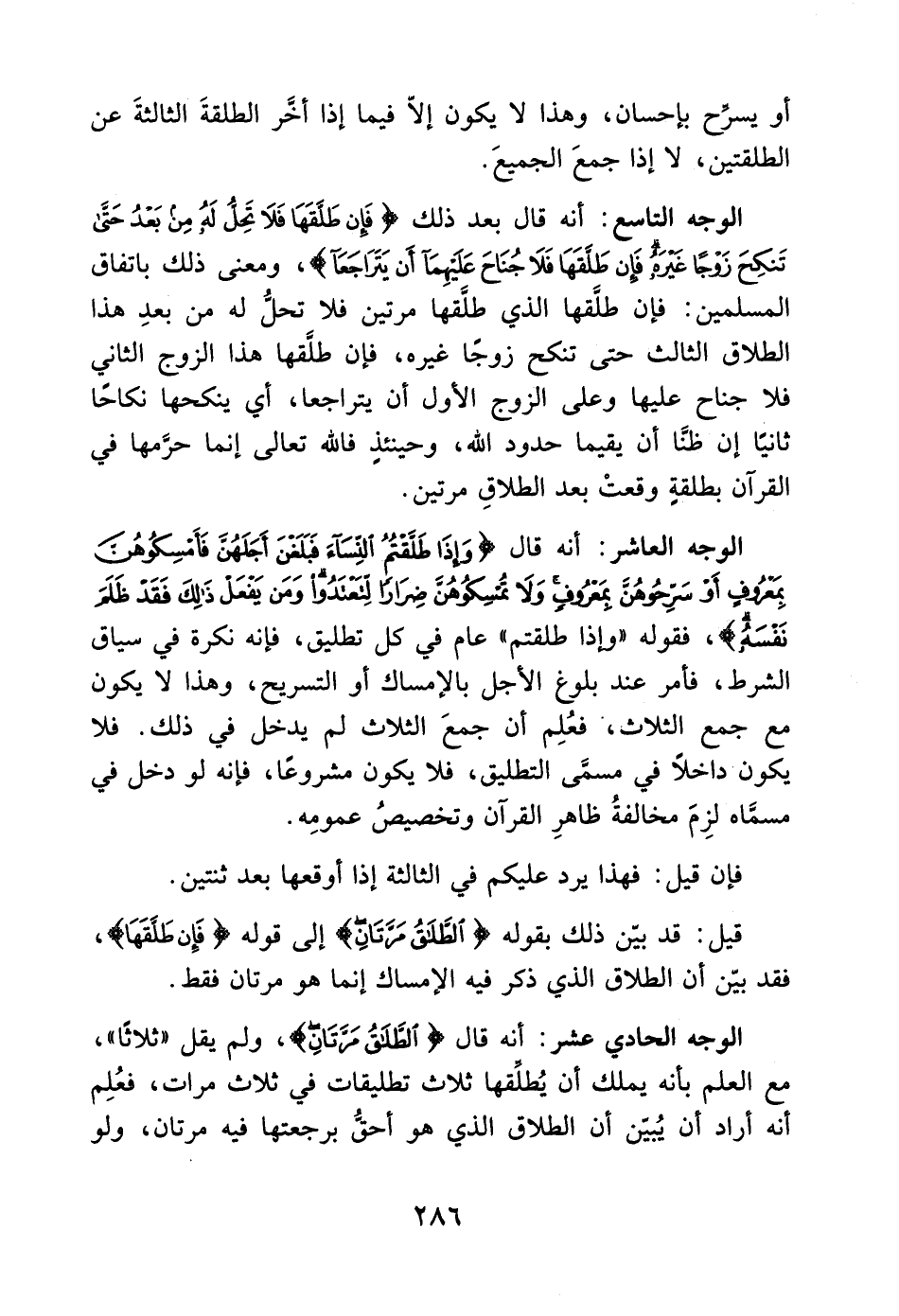 الوجه العاشر: أنه قال (وَإِذَا طَلَّقْتُمُ النِّسَاءَ فَبَلَغْنَ أَجَلَهُنَّ فَأَمْسِكُوهُنَّ بِمَعْرُوفٍ أَوْ سَرِّحُوهُنَّ بِمَعْرُوفٍ وَلَا تُمْسِكُوهُنَّ ضِرَارًا لِتَعْتَدُوا وَمَنْ يَفْعَلْ ذَلِكَ فَقَدْ ظَلَمَ نَفْسَهُ)، فقوله "وإذا طلقتم" عام في كل تطليق، فإنه نكرة في سياق الشرط، فأمر عند بلوغ الأجل بالإمساك أو التسريح، وهذا لا يكون مع جمع الثلاث، فعُلِم أن جمعَ الثلاث لم يدخل في ذلك. فلا يكونْ داخلا في مسمَّى التطليق، فلا يكون مشروعا، فإنه لو دخل في مسمَّاه لزِمَ مخالفةُ ظاهرِ القرآن وتخصيصُ عمومِه.