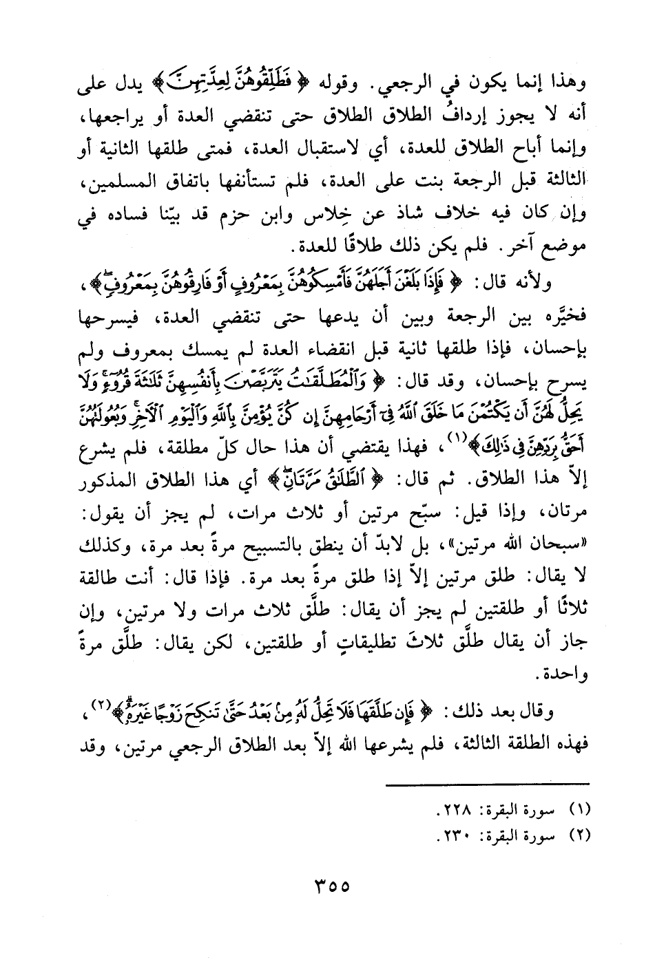 ولأنه قال: (فَإِذَا بَلَغْنَ أَجَلَهُنَّ فَأَمْسِكُوهُنَّ بِمَعْرُوفٍ أَوْ فَارِقُوهُنَّ بِمَعْرُوفٍ)، فخيَّره بين الرجعة وبين أن يدعها حتى تنقضي العدة، فيسرحها بإحسان، فإذا طلقها ثانية قبل انقضاء العدة لم يمسك بمعروف ولم يسرح بإحسان، وقد قال: (وَالْمُطَلَّقَاتُ يَتَرَبَّصْنَ بِأَنْفُسِهِنَّ ثَلاثَةَ قُرُوءٍ وَلا يَحِلُّ لَهُنَّ أَنْ يَكْتُمْنَ مَا خَلَقَ اللَّهُ فِي أَرْحَامِهِنَّ إِنْ كُنَّ يُؤْمِنَّ بِاللَّهِ وَالْيَوْمِ الْآخِرِ وَبُعُولَتُهُنَّ أَحَقُّ بِرَدِّهِنَّ فِي ذَلِكَ) (1)، فهذا يقتضي أن هذا حال كلّ مطلقة، فلم يشرع إلاّ هذا الطلاق. ثم قال: (الطَّلاقُ مَرَّتَانِ) أي هذا الطلاق المذكور مرتان، وإذا قيل: سبّح مرتين أو ثلاث مرات، لم يجز أن يقول: "سبحان الله مرتين"، بل لابدّ أن ينطق بالتسبيح مرةً بعد مرة، وكذلك لا يقال: طلق مرتين إلاّ إذا طلق مرةً بعد مرة. فإذا قال: أنت طالقة ثلاثًا أو طلقتين لم يجز أن يقال: طلَّق ثلاث مرات ولا مرتين، وإن جاز أن يقال طلَّق ثلاثَ تطليقاتٍ أو طلقتين، لكن يقال: طلَّق مرةً واحدة.