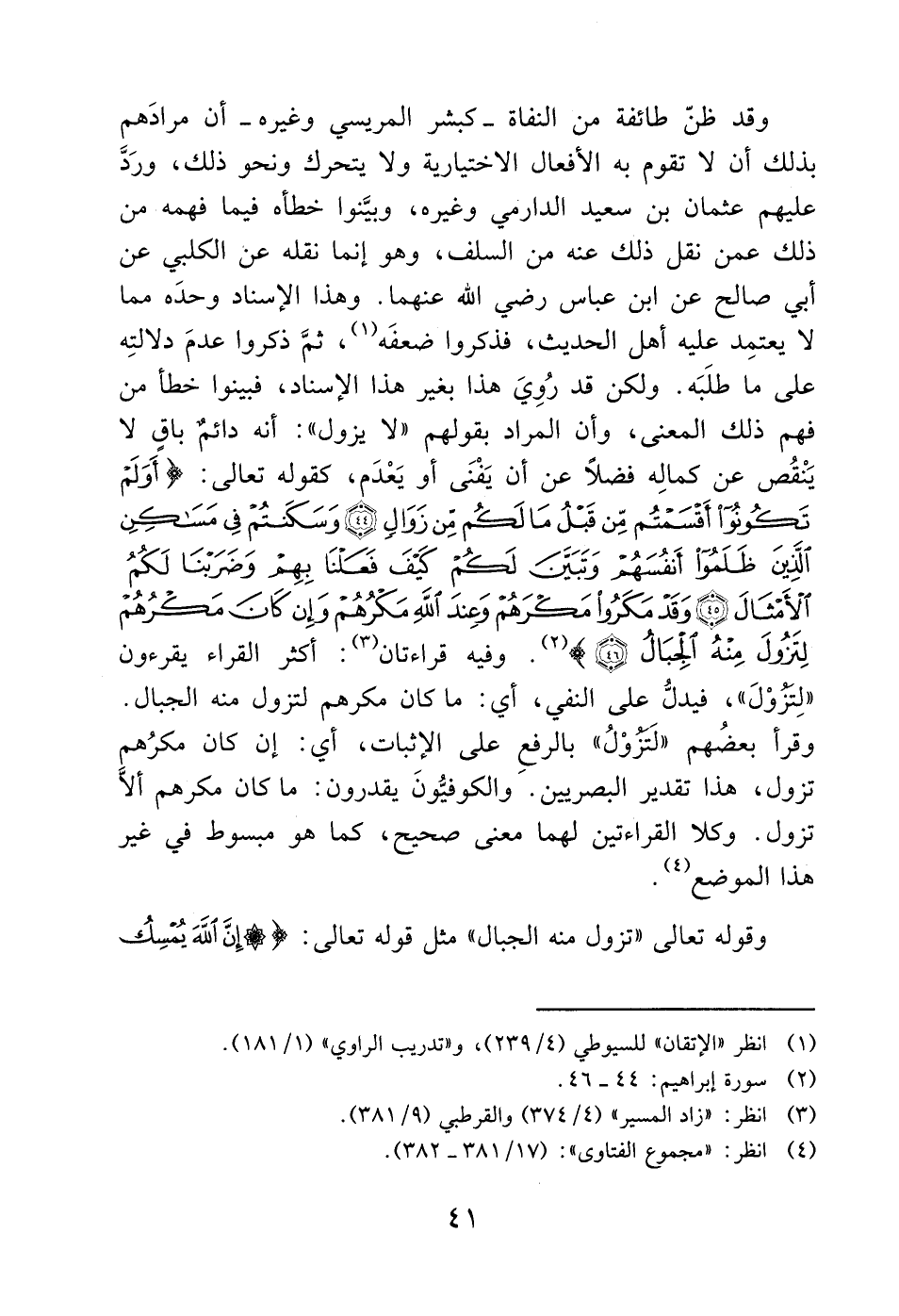 وقد ظنّ طائفة من النفاة - كبشر المريسي وغيره - أن مرادَهم بذلك أن لا تقوم به الأفعال الاختيارية ولا يتحرك ونحو ذلك، ورَدَّ عليهم عثمان بن سعيد الدارمي وغيره، وبيَّنوا خطأه فيما فهمه من ذلك عمن نقل ذلك عنه من السلف، وهو إنما نقله عن الكلبي عن أبي صالح عن ابن عباس رضي الله عنهما. وهذا الإسناد وحدَه مما لا يعتمِد عليه أهل الحديث، فذكروا ضعفَه (1)، ثمَّ ذكروا عدمَ دلالتِه على ما طلَبَه. ولكن قد رُوِيَ هذا بغير هذا الإسناد، فبينوا خطأ من فهم ذلك المعنى، وأن المراد بقولهم "لا يزول": أنه دائمٌ باقٍ لا يَنْقُص عن كمالِه فضلاً عن أن يَفْنَى أو يَعْدَم، كقوله تعالى: (أولم تكونوا أقسمتم من قبل ما لكم من زوال (44) وسكنتم في مساكن الذين ظلموا أنفسهم وتبين لكم كيف فعلنا بهم وضربنا لكم الأمثال (45) وقد مكروا مكرهم وعند الله مكرهم وإن كان مكرهم لتزول منه الجبال (46)) (2). وفيه قراءتان (3): أكثر القراء يقرءون "لِتزوْلَ"، فيدلُّ على النفي، أي: ما كان مكرهم لتزول منه الجبال.