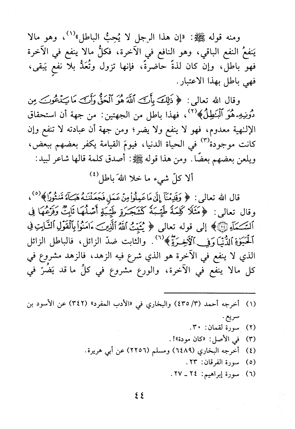 قال الله تعالى: (وقدمنا إلى ما علموا من عمل فجعلناه هباءً منثوراً) (5)، وقال تعالى: (مثلاً كلمةً طيبةً كشجرةٍ طيبةٍ أصلها ثابت وفرعها في السماء (24)) إلى قوله تعالى (يثبت الله الذين آمنوا بالقول الثابت في الحيَاةِ الدُّنيا وفي الأخرةِ) (6). والثابت ضدّ الزائل، فالباطل الزائل الذي لا ينفع في الآخرة هو الذي شرع فيه الزهد، فالزهد مشروع في كل مالا ينفع في الآخرة، والورع مشروع في كلِّ ما قد يَضُرّ في