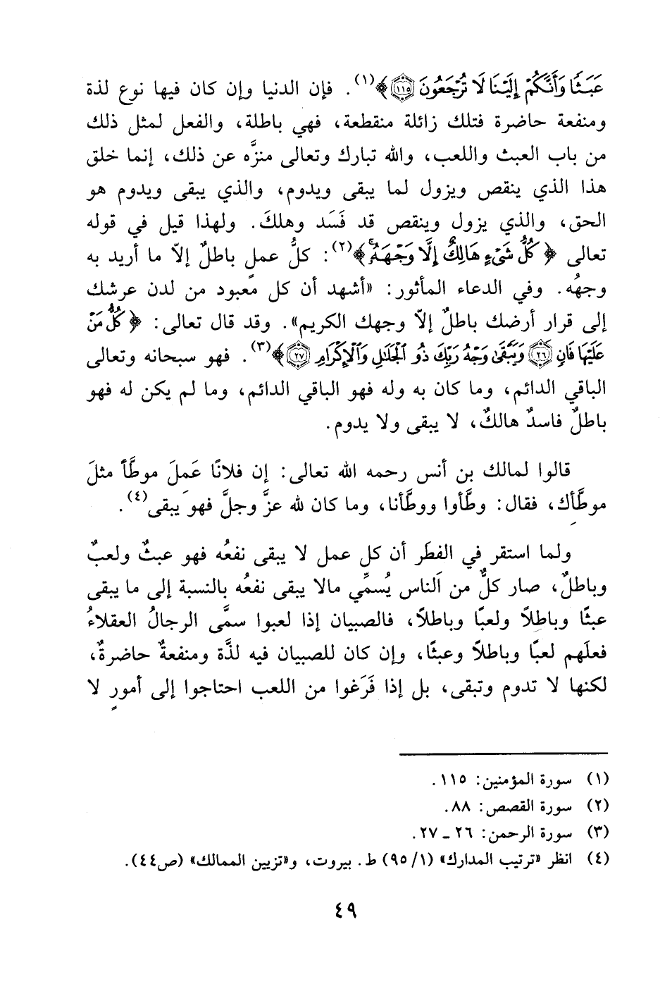 عَبَثاً وَأنَكم إلينا لا ترجعون) (1). فإن الدنيا وإن كان فيها نوع لذة ومنفعة حاضرة فتلك زائلة منقطعة، فهي باطلة، والفعل لمثل ذلك من باب العبث واللعب، والله تبارك وتعالى منزَّه عن ذلك، إنما خلق هذا الذي ينقص ويزول لما يبقى ويدوم، والذي يبقى ويدوم هو الحق، والذي يزول وينقص قد فَسَد وهلكَ. ولهذا قيل في قوله تعالى (كل شيءٍ هالك إلا وجهه) (2): كلُّ عملٍ باطل إلاّ ما أريد به وجهُه. وفي الدعاء المأثور: "أشهد أن كل معبود من لدن عرشك إلى قرار أرضك باطلٌ إلاّ وجهك الكريم". وقد قال تعالى: (كل مَن عليها فَان (26) ويبقى وجه ربك ذو الجلال والإكرام (27)) (3). فهو سبحانه وتعالى الباقي الدائم، وما كان به وله فهو الباقي الدائم، وما لم يكن له فهو باطل فاسدٌ هالكٌ، لا يبقى ولا يدوم.