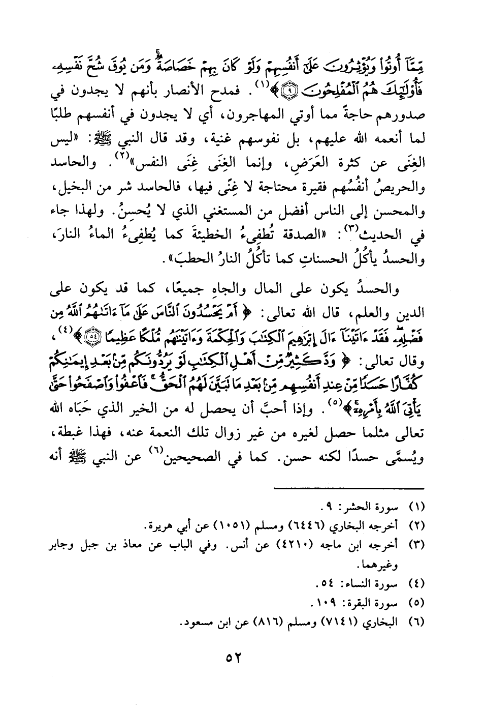مما أوتوا ويؤثرون على أنفسهم ولو كان بهم خصاصة ومن يوق شح نفسه فأولئك هم المفلحون (9)) (1). فمدح الأنصار بأنهم لا يجدون في صدورهم حاجة مما أوتي المهاجرون، أي لا يجدون في أنفسهم طلبًا لما أنعمه الله عليهم، بل نفوسهم غنية، وقد قال النبي - صَلَّى اللَّهُ عَلَيْهِ وَسَلَّمَ -: "ليس الغِنَى عن كثرة العَرَضِ، وإنما الغِنَى غِنَى النفس" (2). والحاسد والحريصُ أنفُسُهم فقيرة محتاجة لا غِنًى فيها، فالحاسد شر من البخيل، والمحسن إلى الناس أفضل من المستغني الذي لا يُحسِنُ. ولهذا جاء في الحديث (3): "الصدقة تُطفِئُ الخطيئةَ كما يُطفِئُ الماءُ النارَ، والحسدُ يأكُلُ الحسناتِ كما تأكُلُ النارُ الحطبَ".