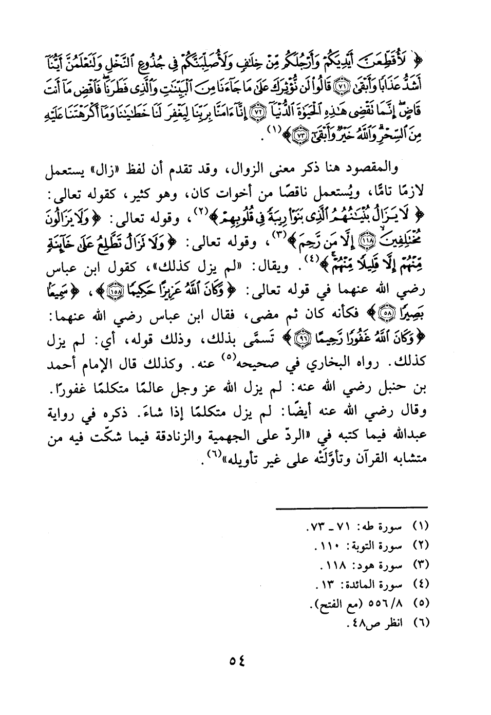 والمقصود هنا ذكر معنى الزوال، وقد تقدم أن لفظ "زال" يستعمل لازمًا تامًا، ويُستعمل ناقصًا من أخوات كان، وهو كثير، كقوله تعالى: (لا يزال بنيانهم الذي بنوا ريبة في قلوبهم) (2)، وقوله تعالى: (وَلَا يَزَالُونَ مختلفين (118) إلا من رحم) (3)، وقوله تعالى: (وَلَا تزَال تطلع عَلى خائنة منهم إلا قلَيلًا منْهُم) (4). ويقال: "لم يزل كذلك"، كقول ابن عباس رضي الله عنهما في قوله تعالى: (وكَاَنَ اَللهُ عَزيزًا حكِيماً (158))، (سميعا بَصِيرًا (58)) فكأنه كان ثم مضى، فقال ابن عباس رضي الله عنهما: (وَكاَنَ اللهُ غَفُورًا رحِيمًا (96)) تَسمَّى بذلك، وذلك قوله، أي: لم يزل كذلك. رواه البخاري في صحيحه (5) عنه. وكذلك قال الإمام أحمد بن حنبل رضي الله عنه: لم يزل الله عز وجل عالمًا متكلمًا غفورًا.
