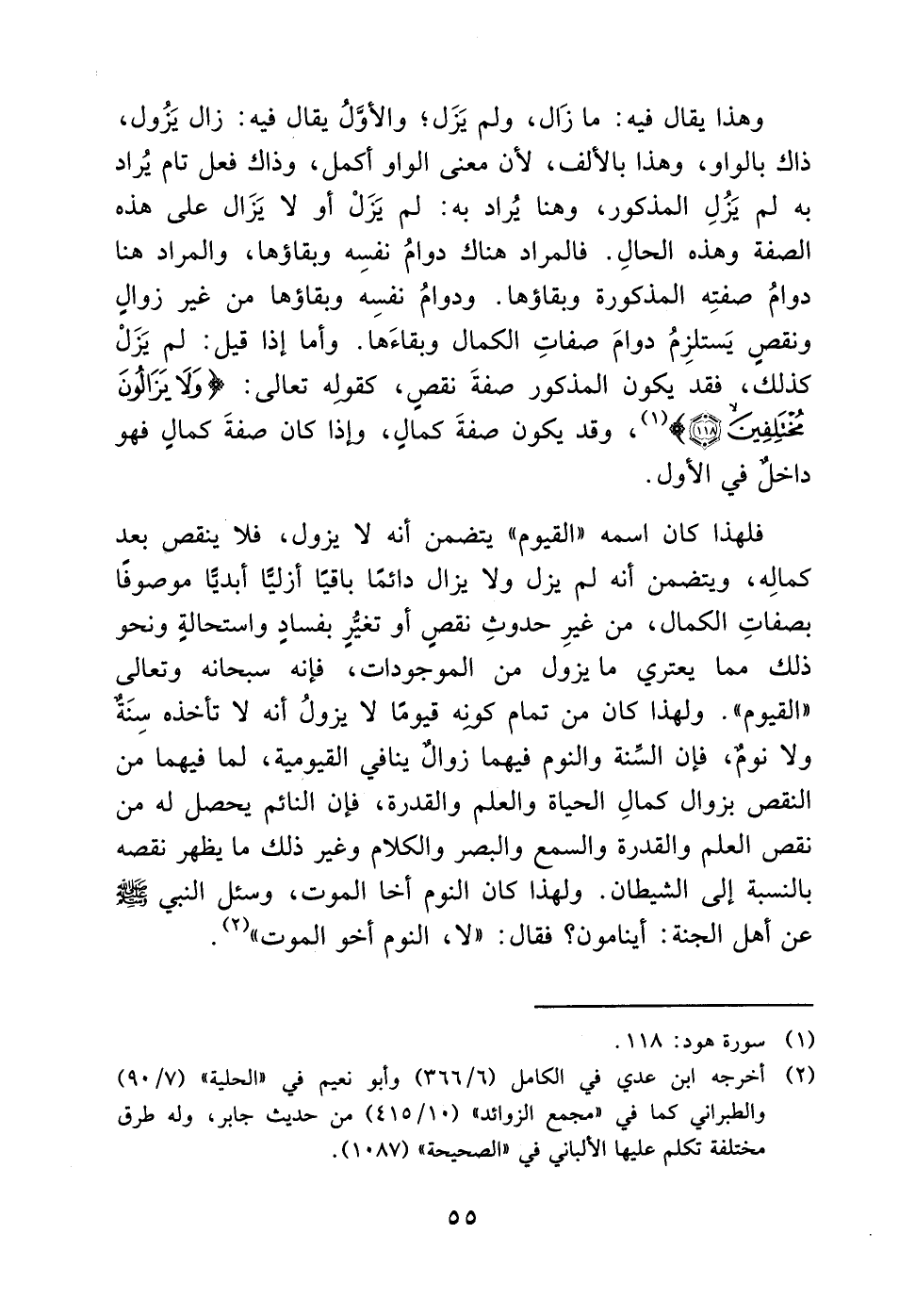 وهذا يقال فيه: ما زَال، ولم يَزَل؛ والأوَّلُ يقال فيه: زال يَزُول، ذاك بالواو، وهذا بالألف، لأن معنى الواو أكمل، وذاك فعل تام يُراد به لم يَزُلِ المذكور، وهنا يُراد به: لم يَزَلْ أو لا يَزَال على هذه الصفة وهذه الحالِ. فالمراد هناك دوامُ نفسِه وبقاؤها، والمراد هنا دوامُ صفتِه المذكورة وبقاؤها. ودوامُ نفسِه وبقاؤها من غير زوالٍ ونقصٍ يَستلزِمُ دوامَ صفاتِ الكمال وبقاءَها. وأما إذا قيل: لم يَزَلْ كذلك، فقد يكون المذكور صفةَ نقصٍ، كقوله تعالى: (وَلَا يَزَالُونَ مختلفين (118)) (1)، وقد يكون صفةَ كمالٍ، وإذا كان صفةَ كمالٍ فهو داخلٌ في الأول.