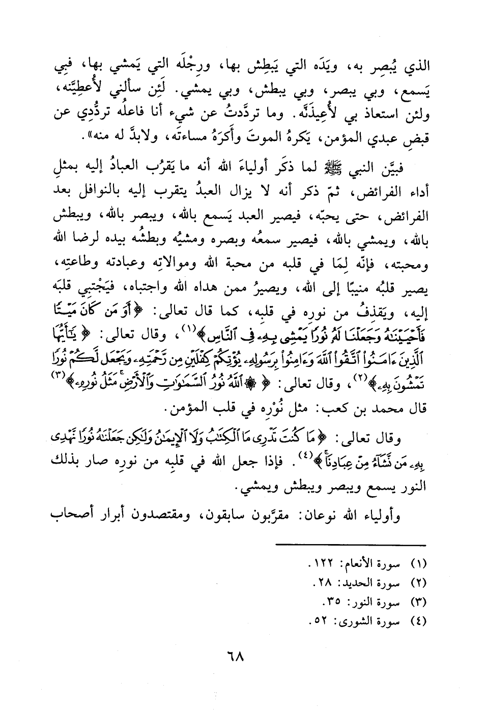فبيَّن النبي - صَلَّى اللَّهُ عَلَيْهِ وَسَلَّمَ - لما ذكَر أولياءَ الله أنه ما يَقرُب العبادُ إليه بمثلِ أداء الفرائض، ثمّ ذكر أنه لا يزال العبدُ يتقرب إليه بالنوافل بعد الفرائض، حتى يحبّه، فيصير العبد يَسمع بالله، ويبصر بالله، ويبطش بالله، ويمشي بالله، فيصير سمعُه وبصره ومشيُه وبطشُه بيده لرضا الله ومحبته، فإنّه لِمَا في قلبه من محبة الله وموالاتِه وعبادته وطاعتِه، يصير قلبُه منيبًا إلى الله، ويصيرُ ممن هداه الله واجتباه، فيَجْتبِي قلبَه إليه، ويَقذِفُ من نورِه في قلبِه، كما قال تعالى: (أَوَمَن كاَنَ مَيتًا فأحييناه وجعلنا له نورًا يمشى به في الناس) (1)، وقال تعالى: (يآ أيُّهَا اَلَّذِينَ آمنوا اَتَّقُوْا الله وَءَامِنُواْ بِرَسُوِلهِ يؤتِكم كِفلَين مِن رَّحمَتِهِ ويجعل لكم نُورا تَمشُونَ بِهِ) (2)، وقال تعالى: (* الله نُورُ اَلسَّمَاواتِ وَالأرض مَثَلُ نُورِه) (3) قال محمد بن كعب: مثل نُوْرِه في قلب المؤمن.