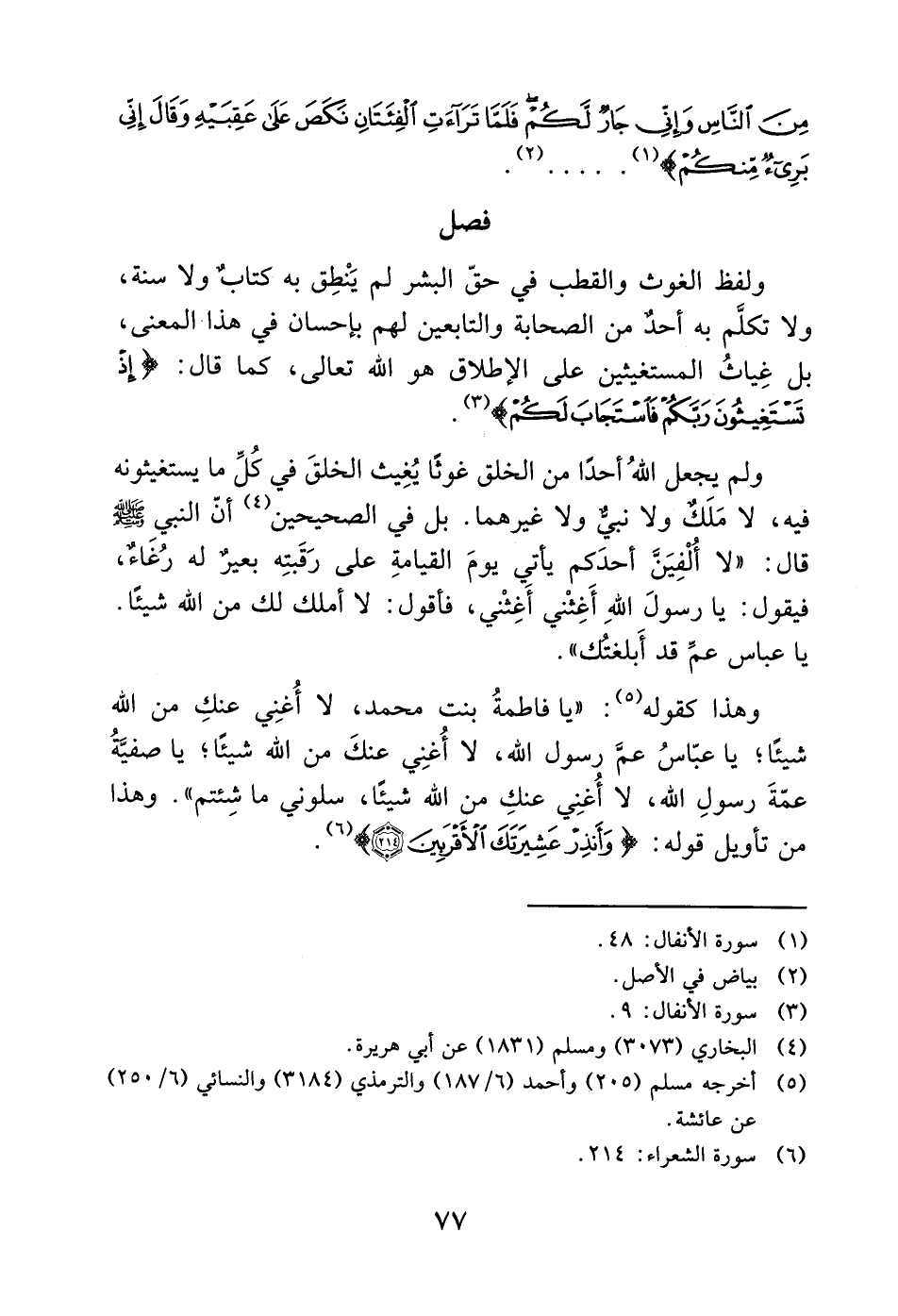 ولم يجعل الله أحدًا من الخلق غوثًا يُغِيث الخلقَ في كُلِّ ما يستغيثونه فيه، لا مَلَك ولا نبي ولا غيرهما. بل في الصحيحين (4) أنّ النبي - صَلَّى اللَّهُ عَلَيْهِ وَسَلَّمَ - قال: "لا أُلْفِيَنَّ أحدَكم يأتي يومَ القيامةِ على رَقَبتِه بعيرٌ له رُغَاءٌ، فيقول: يا رسولَ الله أَغِثْني أَغِثْني، فأقول: لا أملك لك من الله شيئًا. يا عباس عمِّ قد أَبلغتك".
