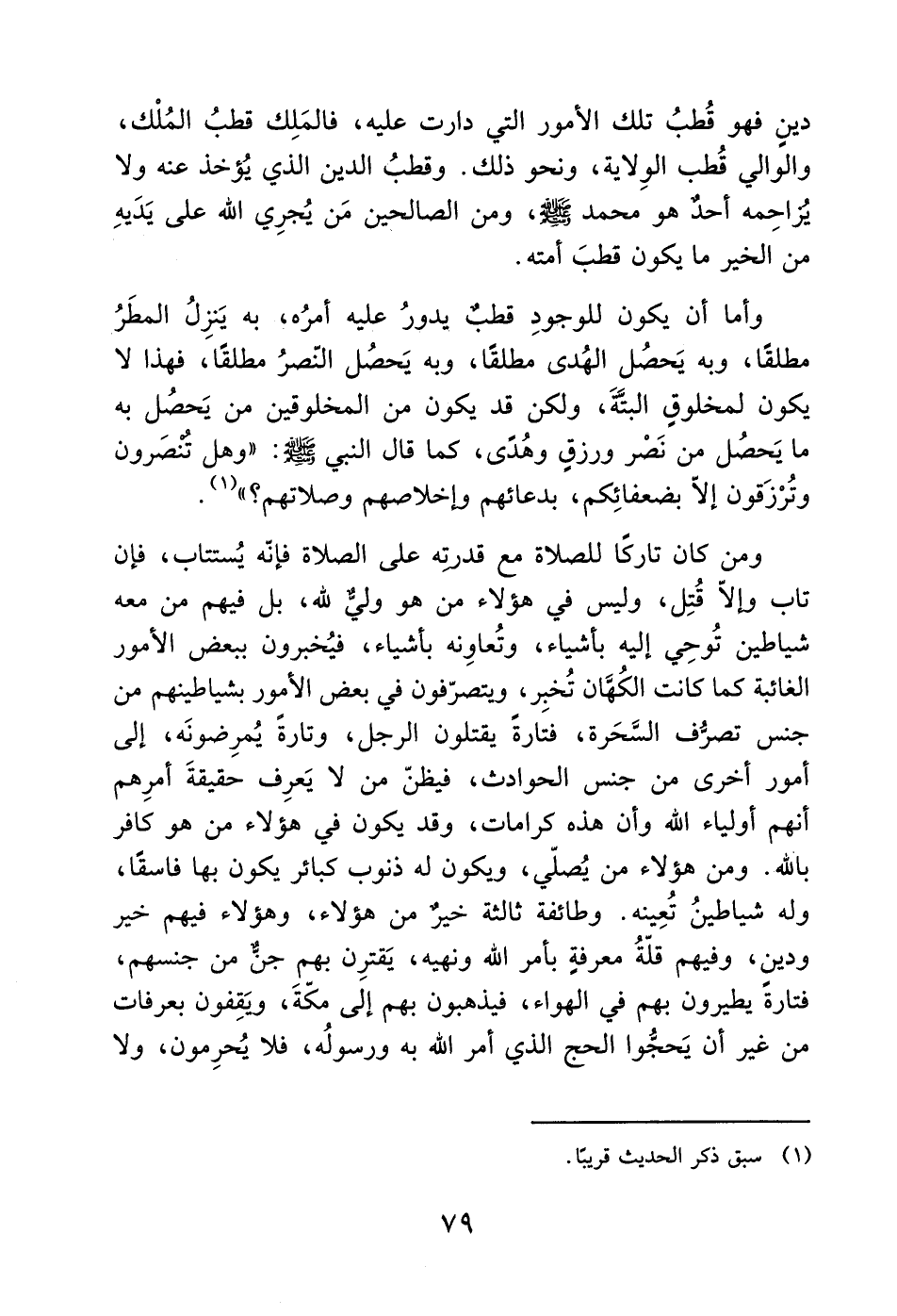 وأما أن يكون للوجودِ قطبٌ يدورُ عليه أمرُه، به يَنزِلُ المطَرُ مطلقًا، وبه يَحصُل الهُدى مطلقًا، وبه يَحصُل النّصرُ مطلقًا، فهذا لا يكون لمخلوقٍ البتةَ، ولكن قد يكون من المخلوقين من يَحصُل به ما يَحصُل من نَصْر ورزقٍ وهُدًى، كما قال النبي - صَلَّى اللَّهُ عَلَيْهِ وَسَلَّمَ -: "وهل تنصَرون وتُرْزَقون إلاّ بضعفائِكم، بدعائهم وإخلاصهم وصلاتهم؟ " (1).