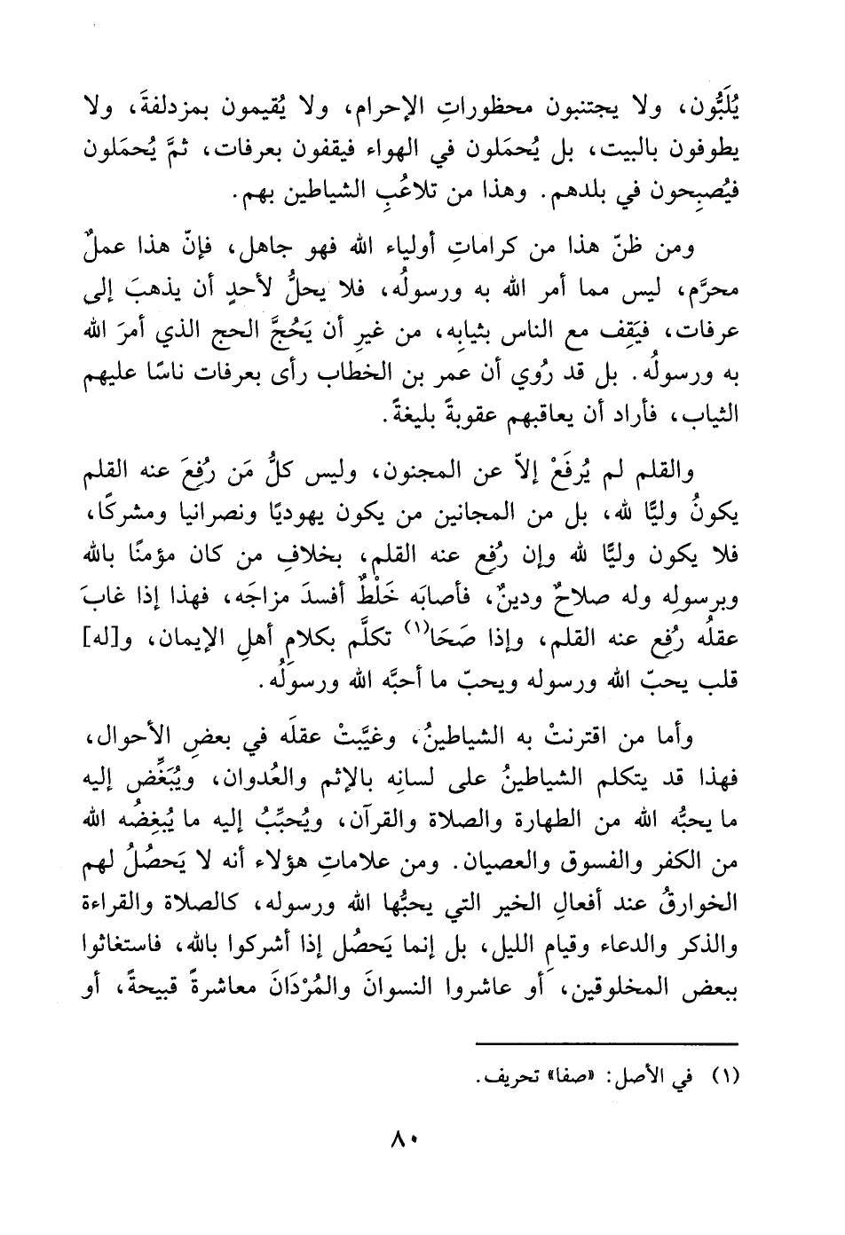 والقلم لم يُرفَعْ إلاّ عن المجنون، وليس كلُّ مَن رُفِعَ عنه القلم يكونُ وليًّا لله، بل من المجانين من يكون يهوديًا ونصرانيا ومشركًا، فلا يكون وليًّا لله وإن رُفِع عنه القلم، بخلافِ من كان مؤمنًا بالله وبرسوله وله صلاحٌ ودينٌ، فأصابَه خَلْطٌ أفسدَ مزاجَه، فهذا إذا غابَ عقلُه رُفِع عنه القلم، وإذا صَحَا (1) تكلَّم بكلامِ أهلِ الإيمان، و [له] قلب يحبّ الله ورسوله ويحبّ ما أحبَّه الله ورسوله.