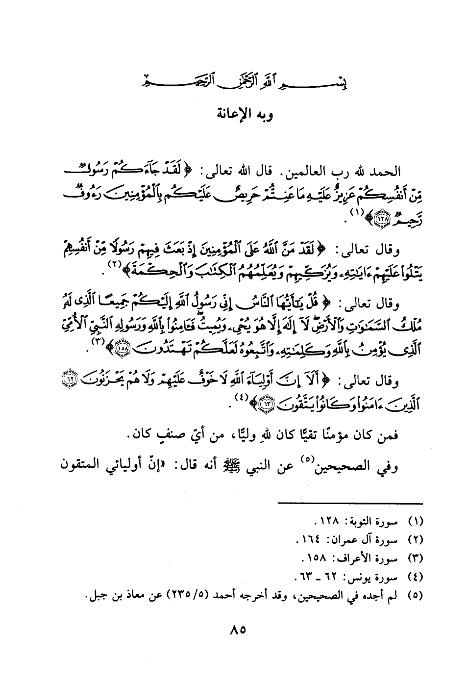 وقال تعالى: (ألا إن أولياء الله لا خوف عليهم ولا هم يحزنون (62) الذين آمنوا وكانوا يتقون (63)) (4).