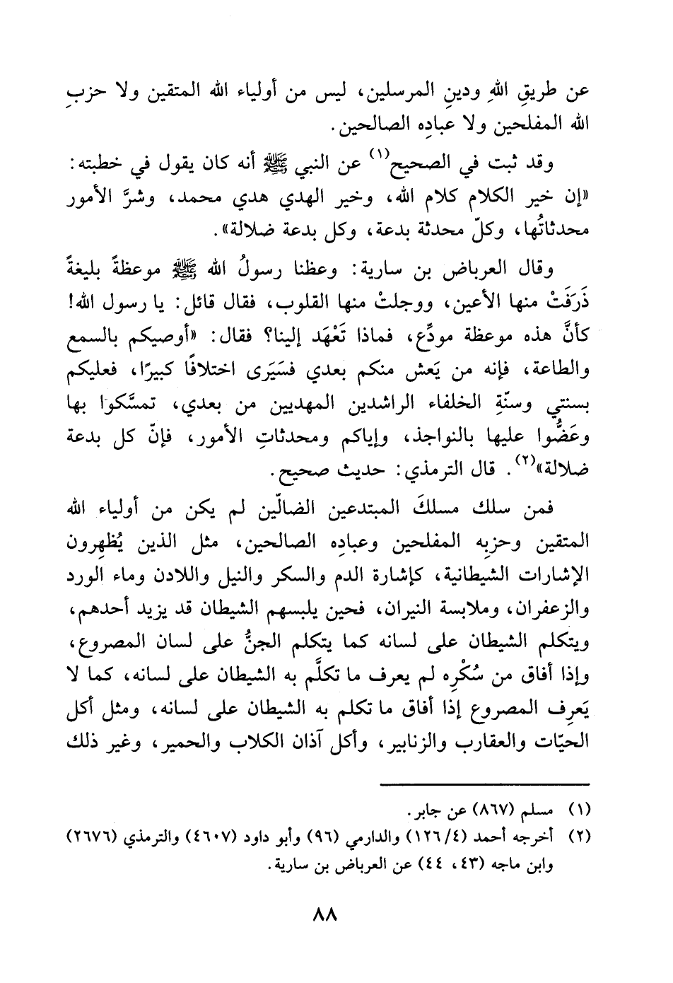 فمن سلك مسلكَ المبتدعين الضالّين لم يكن من أولياء الله المتقين وحزبِه المفلحين وعبادِه الصالحين، مثل الذين يُظهِرون الإشارات الشيطانية، كإشارة الدم والسكر والنيل واللادن وماء الورد والزعفران، وملابسة النيران، فحين يلبسهم الشيطان قد يزيد أحدهم، ويتكلم الشيطان على لسانه كما يتكلم الجنُّ على لسان المصروع، وإذا أفاق من سُكْرِه لم يعرف ما تكلَّم به الشيطان على لسانه، كما لا يَعرِف المصروع إذا أفاق ما تكلم به الشيطان على لسانه، ومثل أكل الحيّات والعقارب والزنابير، وأكل آذان الكلاب والحمير، وغير ذلك
