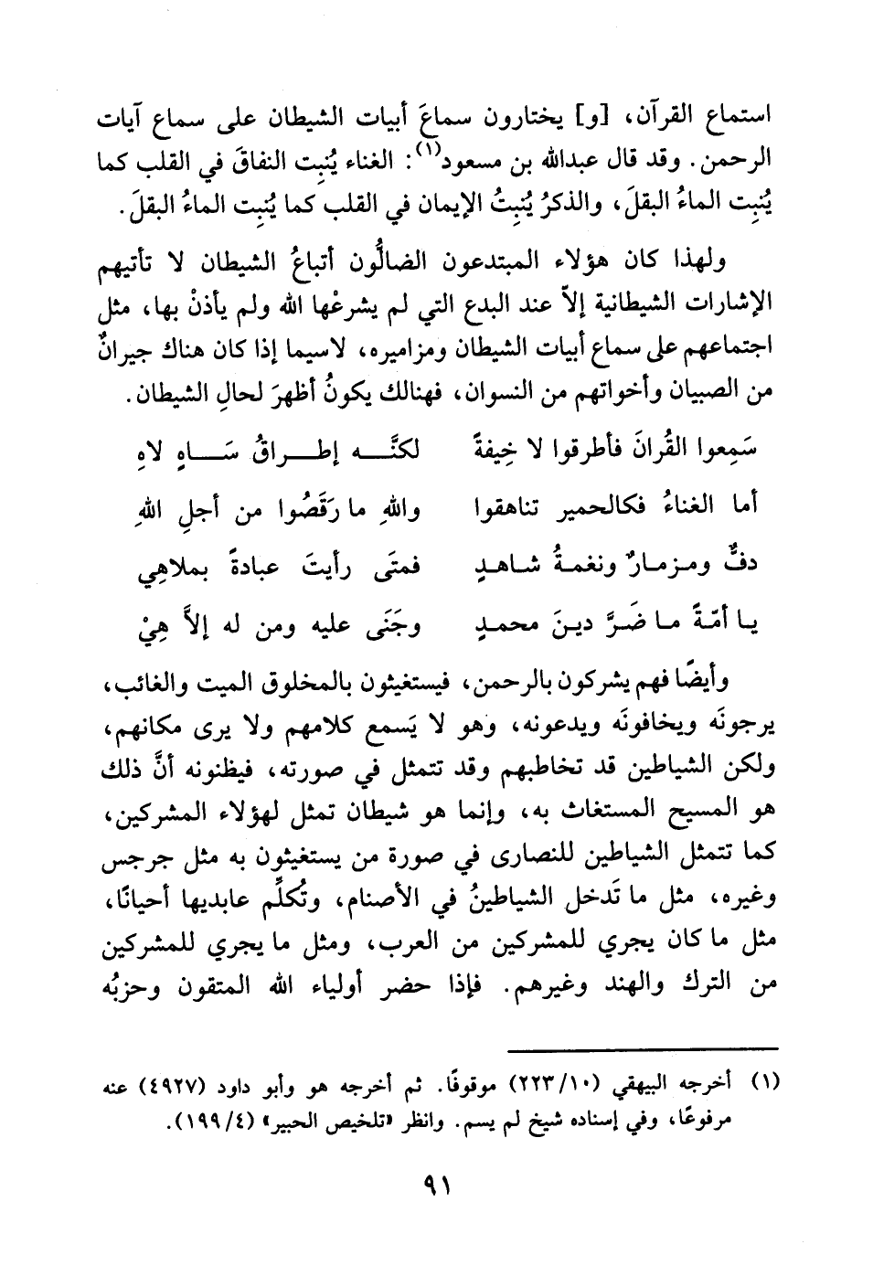 استماع القرآن، [و] يختارون سماعَ أبيات الشيطان على سماع آيات الرحمن. وقد قال عبد الله بن مسعود (1): الغناء يُنبت النفاقَ في القلب كما يُنبِت الماءُ البقلَ، والذكرُ ينبِتُ الإيمان في القلبَ كما ينبِت الماءُ البقلَ.