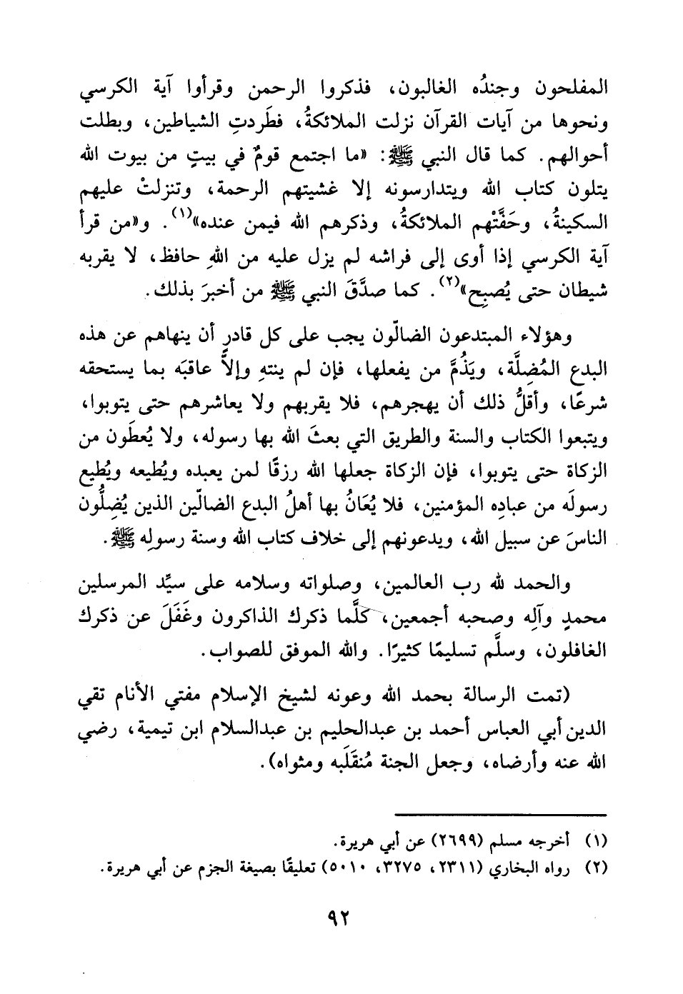 (تمت الرسالة بحمد الله وعونه لشيخ الإسلام مفتي الأنام تقي الدين أبي العباس أحمد بن عبد الحليم بن عبد السلام ابن تيمية، رضي الله عنه وأرضاه، وجعل الجنة مُنقَلَبه ومثواه).