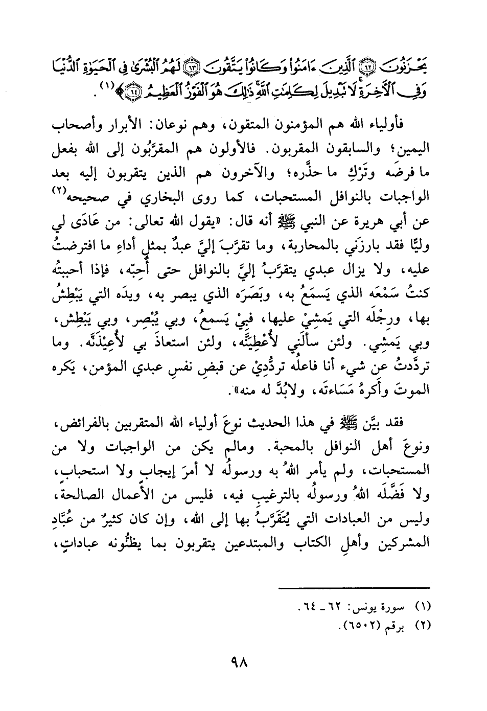 فأولياء الله هم المؤمنون المتقون، وهم نوعان: الأبرار وأصحاب اليمين؛ والسابقون المقربون. فالأولون هم المقرَّبُون إلى الله بفعل ما فرضه وتَرْكِ ما حذَّره؛ والآخرون هم الذين يتقربون إليه بعد الواجبات بالنوافل المستحبات، كما روى البخاري في صحيحه (2) عن أبي هريرة عن النبي - صَلَّى اللَّهُ عَلَيْهِ وَسَلَّمَ - أنه قال: "يقول الله تعالى: من عَادَى لي وليًّا فقد بارزَني بالمحاربة، وما تقرَّبَ إليَّ عبد بمثل أداءِ ما افترضتُ عليه، ولا يزال عبدي يتقرَّبُ إليَّ بالنوافل حتى أحِبّه، فإذا أحببتُه كنتُ سَمْعَه الذي يَسمَعُ به، وبَصَرَه الذي يبصر به، ويدَه التي يَبْطِشُ بها، ورِجْلَه التي يَمشيْ عليها، فبِيْ يَسمعُ، وبي يُبْصِر، وبي يَبْطِش، وبي يَمشِي. ولئن سألني لأعْطِيَنَّه، ولئن استعاذَ بي لأعِيْذَنِّه. وما تردَّدتُ عن شيء أنا فاعلُه تردُّدِيْ عن قبضِ نفسِ عبدي المؤمن، يَكره الموتَ وأَكرهُ مَسَاءتَه، ولابُدَّ له منه".