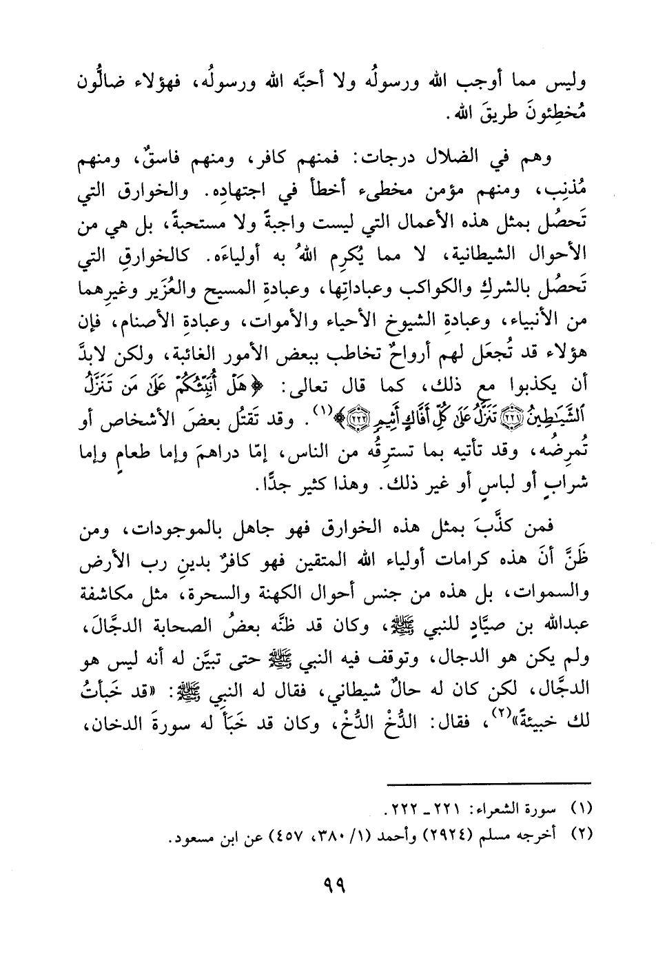 فمن كذَّبَ بمثل هذه الخوارق فهو جاهل بالموجودات، ومن ظَنَّ أنَ هذه كرامات أولياء الله المتقين فهو كافر بدينِ رب الأرض والسماوات، بل هذه من جنس أحوال الكهنة والسحرة، مثل مكاشفة عبد الله بن صيادٍ للنبي - صَلَّى اللَّهُ عَلَيْهِ وَسَلَّمَ -، وكان قد ظنَّه بعضُ الصحابة الدجالَ، ولم يكن هو الدجال، وتوقف فيه النبي - صَلَّى اللَّهُ عَلَيْهِ وَسَلَّمَ - حتى تبين له أنه ليس هو الدجال، لكن كان له حال شيطاني، فقال له النبي - صَلَّى اللَّهُ عَلَيْهِ وَسَلَّمَ -: "قد خَبأتُ لك خبيئةً" (2)، فقال: الدُّخْ الدُّخْ، وكان قد خَبَأَ له سورةَ الدخان،