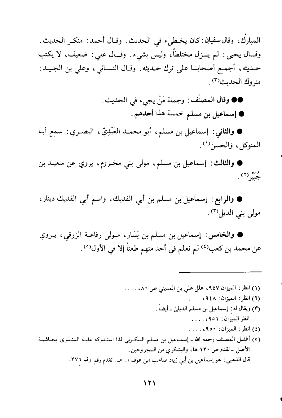 وَالْخَامِس إِسْمَاعِيل بن مُسلم بن يسَار مولى رِفَاعَة الزرقي يروي عَن مُحَمَّد بن كَعْب لم نعلم فِي أحد مِنْهُم طَعنا إِلَّا فِي الأول