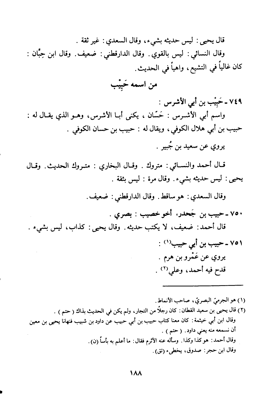 وَقَالَ النَّسَائِيّ لَيْسَ بِالْقَوِيّ وَقَالَ الدَّارَقُطْنِيّ ضَعِيف وَقَالَ ابْن حبَان كَانَ غاليا فِي التَّشَيُّع واهيا فِي الحَدِيث