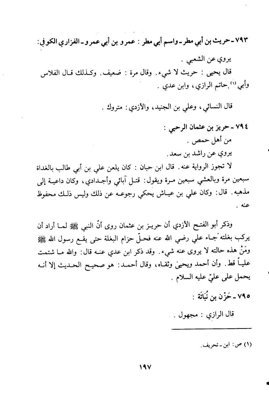 وَذكر أَبُو الْفَتْح الْأَزْدِيّ أَن حريز بن عُثْمَان روى أَن النَّبِي صلى الله عَلَيْهِ وَسلم لما أَرَادَ أَن يركب بغلته جَاءَ عَليّ رَضِي الله عَنهُ فَحل حزَام البغلة حَتَّى يَقع رَسُول الله صلى الله عَلَيْهِ وَسلم وَمن هَذِه حَالَته لَا يروي عَنهُ شَيْء وَقد ذكر ابْن عدي عَنهُ قَالَ وَالله مَا شتمت عليا قطّ وَأَن أَحْمد وَيحيى وثقاه وَقَالَ أَحْمد هُوَ صَحِيح الحَدِيث إِلَّا أَنه يحمل على عَليّ عَلَيْهِ السَّلَام