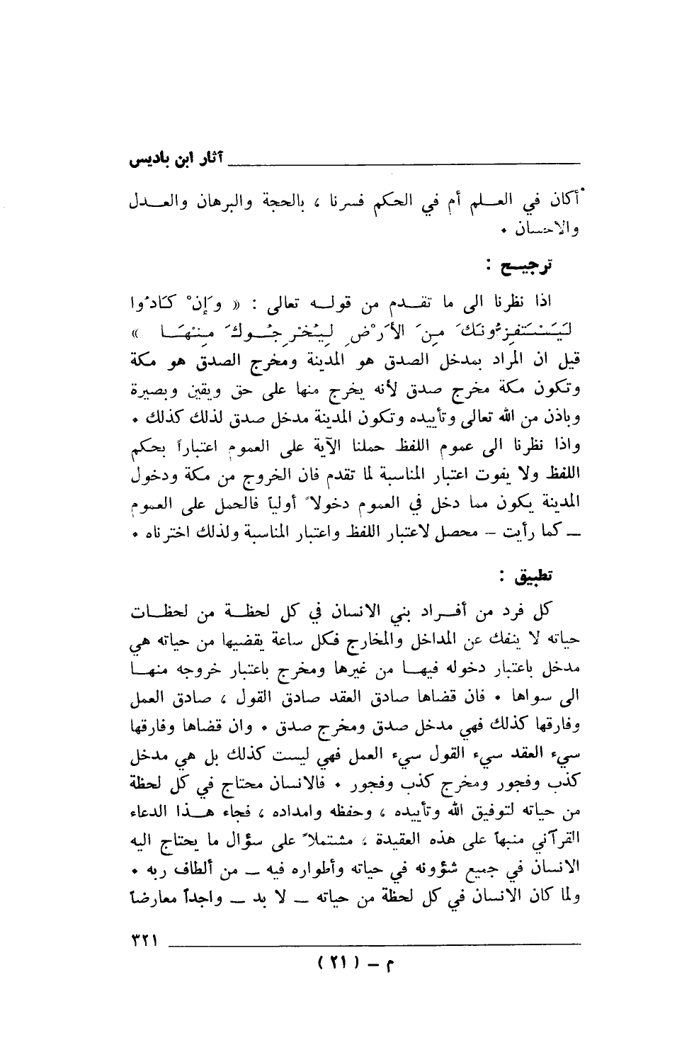 كل فرد من أفراد بني الإنسان في كل لحظة من لحظات حياته لا ينفك عن المداخل والمخارج فكل ساعة يقضيها من حياته هي مدخل باعتبار دخوله فيها من غيرها ومخرج باعتبار خروجه منها إلى سواها. فإن قضاها صادق العقد صادق القول، صادق العمل وفارقها كذلك فهي مدخل صدق ومخرج صدق. وإن قضاها وفارقها سيء العقد سيء القول سيء العمل فهي ليست كذلك بل هي مدخل كذب وفجور ومخرج كذب وفجور. فالإنسان محتاج في كل لحظة من حياته لتوفيق الله وتأييده، وحفظه وإمداده، فجاء هذا الدعاء القرآني منبهاً على هذه العقيدة، مشتملاً على سؤال ما يحتاج إليه الإنسان في جميع شؤونه في حياته وأطواره فيه- من ألطاف ربه. ولما كان الإنسان في كل لحظة من حياته- لا بد- واجداً معارضاً