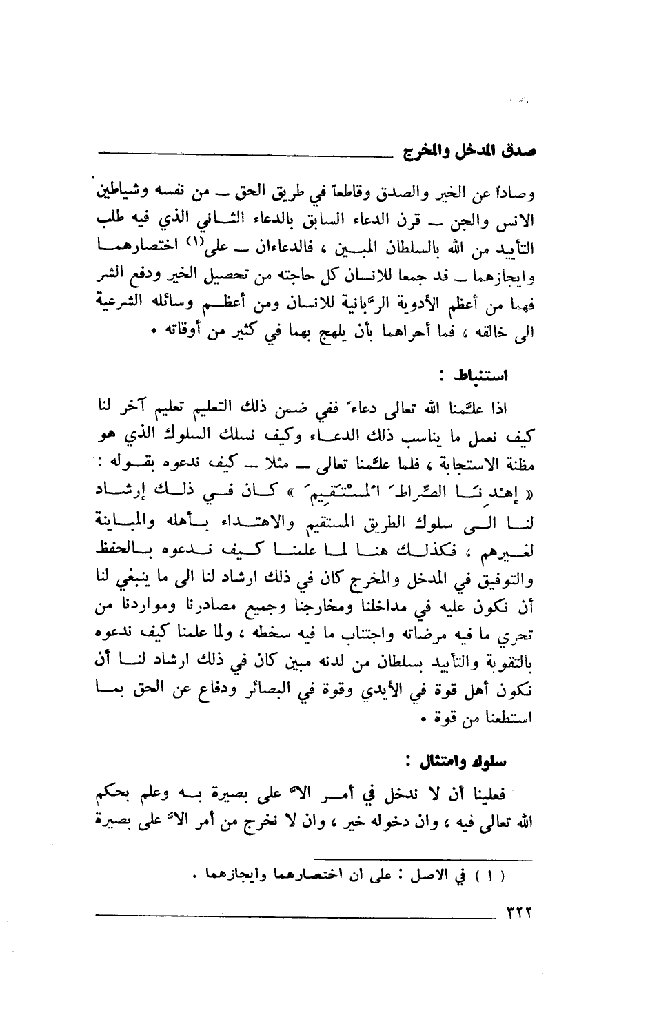 إذا علمنا الله تعالى دعاء ففي ضمن ذلك التعليم تعليم آخر لنا كيف نعمل ما يناسب ذلك الدعاء وكيف نسلك السلوك الذي هو مظنة الاستجابة، فلما علمنا تعالى- مثلا- كيف ندعوه بقوله: {اهْدِنَا الصِّرَاطَ الْمُسْتَقِيمَ} كان في ذلك إرشاد لنا إلى سلوك الطريق المستقيم والإهتداء بأهله والمباينة لغيرهم، فكذلك هنا لما علمنا كيف ندعوه بالحفظ والتوفيق في المدخل والمخرج كان في ذلك إرشاد لنا إلى ما ينبغي لنا أن نكون عليه في مداخلنا ومخارجنا وجميع مصادرنا ومواردنا من تحري ما فيه مرضاته واجتناب ما فيه سخطه، ولما علمنا كيف ندعوه بالتقوية والتأبيد بسلطان من لدنه مبين كان في ذلك إرشاد لنا أن نكون أهل قوة في الأيدي وقوة في البصائر ودفاع عن الحق بما استطعنا من قوة.