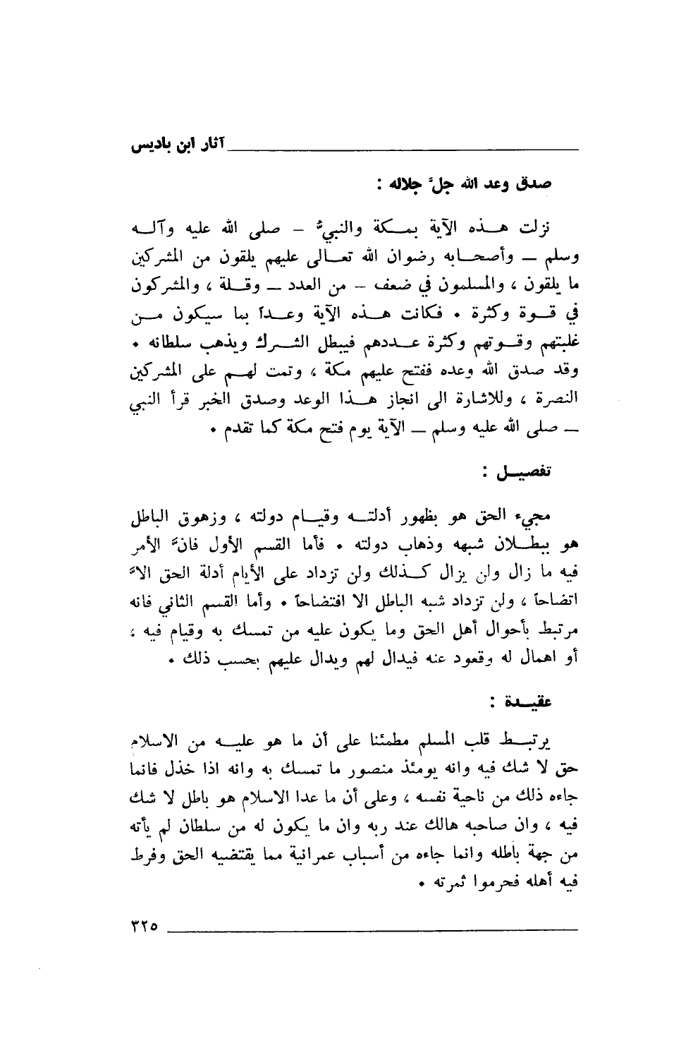 يرتبط قلب المسلم مطمئناً على أن ما هو عليه من الإسلام حق لا شك فيه وأنه يومئذ منصور ما تمسك به وأنه إذا خذل فإنما جاءه ذلك من ناحية نفسه، وعلى أن ما عدا الإسلام هو باطل لا شك فيه، وأن صاحبه هالك عند ربه وأن ما يكون له من سلطان لم يأته من جهة باطله وإنما جاءه من أسباب عمرانية مما يقتضيه الحق وفرط فيه أهله فحرموا ثمرته.