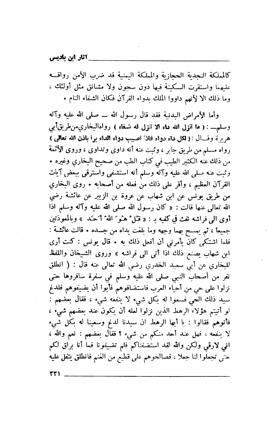 وأما الأمراض البدنية فقد قال رسول الله - صلى الله عليه وآله وسلم-: "ما أنزل الله داء إلا أنزل له شفاء" رواه البخاري من طريق أبي هريرة وقال: "لكل داء دواء فإذا أصيب دواء الداء برأ بإذن الله تعالى" رواه مسلم من طريق جابر، وثبت عنه أنه داوى وتداوى، وروى الأئمة من ذلك عنه الكثير الطيب في كتاب الطب من صحيح البخاري وغيره. وثبت عنه - صلى الله عليه وآله وسلم - أنه استشفى واسترقى ببعض آيات القرآن العظيم، وأقر على ذلك من فعله من أصحابه. روى البخاري من طريق يونس عن ابن شهاب عن عروة بن الزبير عن عائشة - رضي الله تعالى عنها - قالت: "كان رسول الله - صلى الله عليه وآله وسلم - إذا أوى إلى فراشه نفث في كفيه بـ: {قُلْ هُوَ اللَّهُ أَحَدٌ} وبالمعوذتين جميعاً، ثم يمسح بهما وجهه وما بلغت يداه من جسده. قالت عائشة: فلما اشتكى كان يأمرني أن أفعل ذلك به. قال يونس: كنت أرى ابن شهاب يصنع ذلك إذا أتى إلى فراشه" وروى الشيخان واللفط للبخاري عن أبي سعيد الخدري - رضي الله تعالى عنه - قال: "انطلق نفر من أصحاب النبي - صلى الله عليه وسلم - في سفرة سافروها حتى نزلوا على حي من أحياء العرب فاستضافوهم فأبوا أن يضيفوهم فلدغ سيد ذلك الحي فسعوا له بكل شيء لا ينفعه شيء، فقال بعضهم: لو أتيتم هؤلاء الرهط الذين نزلوا لعله أن يكون عند بعضهم شيء، فأتوهم فقالوا: يا أيها الرهط إن سيدنا لدغ وسعينا له بكل شيء لا ينفعه، فهل عند أحد منكم من شيء؟ فقال بعضهم: نعم والله، إني لأرقي ولكن والله لقد استضفناكم فلم تضيفونا فما أنا براق لكم حتى تجعلوا لنا جعلاً، فصالحوهم على قطع من الغنم فانطلق يتفل عليه